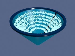 The animation shows a set of particles which have neither a sink nor a source (except at the beginning of the animation). Once created, the particles circulate about the center of the cone at different radii, and are neither created nor destroyed. The vector velocities of the particles as seen from above are directed counterclockwise about the center of the cone.