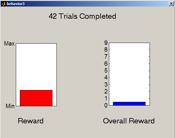 Figure 1: Screen capture of the game. The red bar indicates the reward for the current choice. The blue bar represents the cumulative reward over all of the past trials.