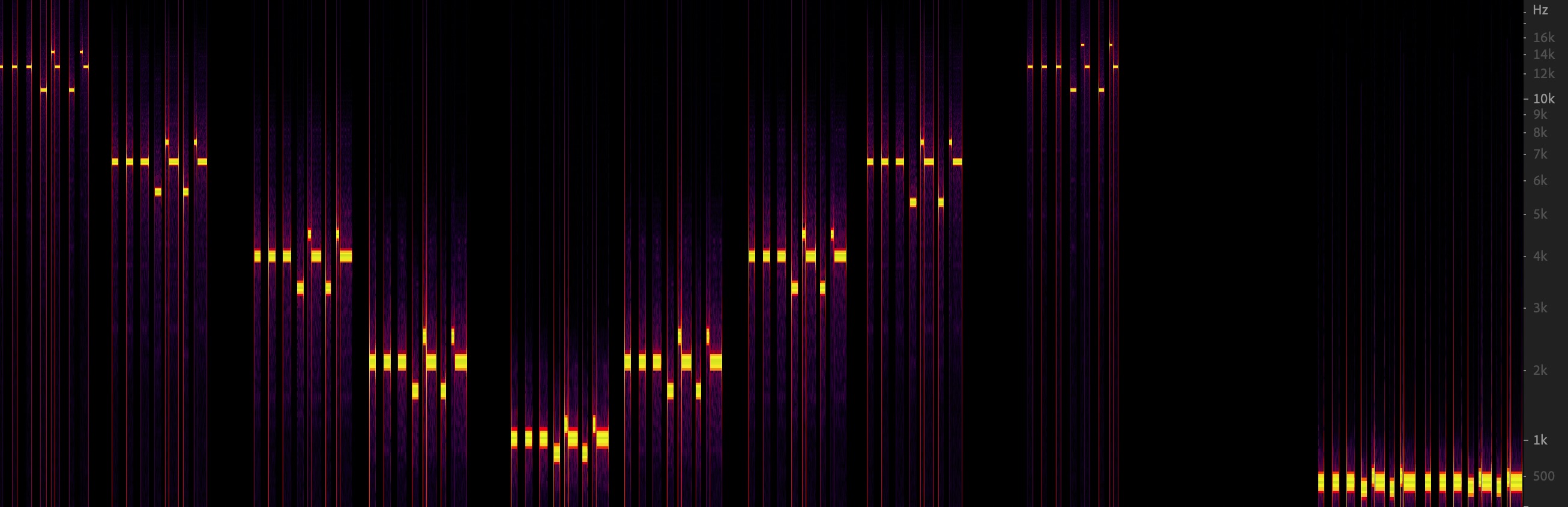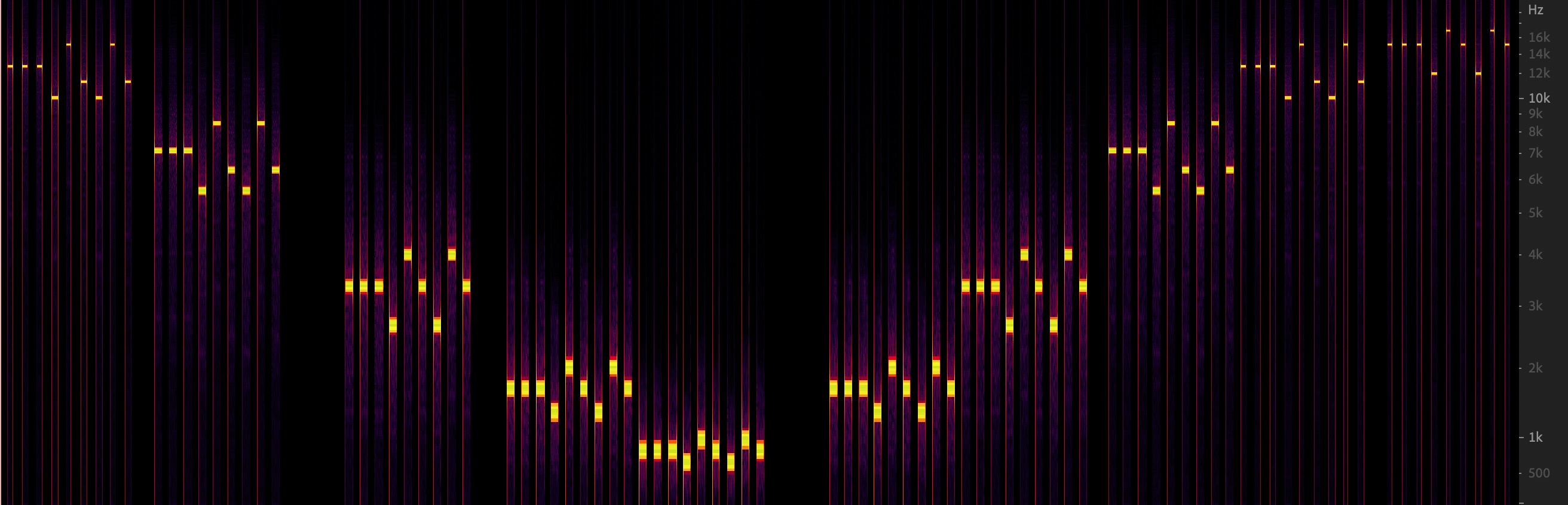 The spectrograms below correspond to the stimulus with rhythm removed (top), the normal rhythm (middle), and hard mode (bottom).