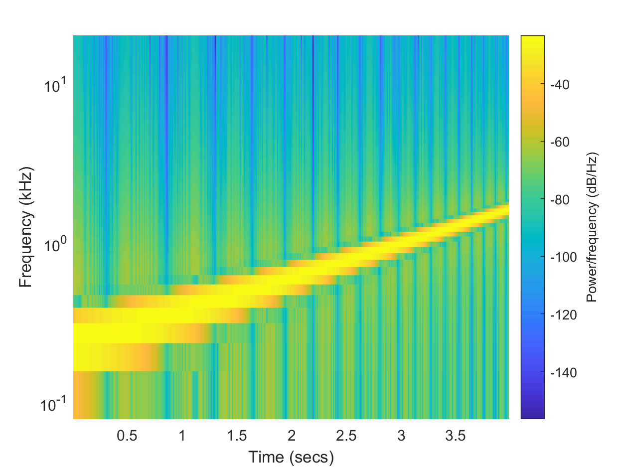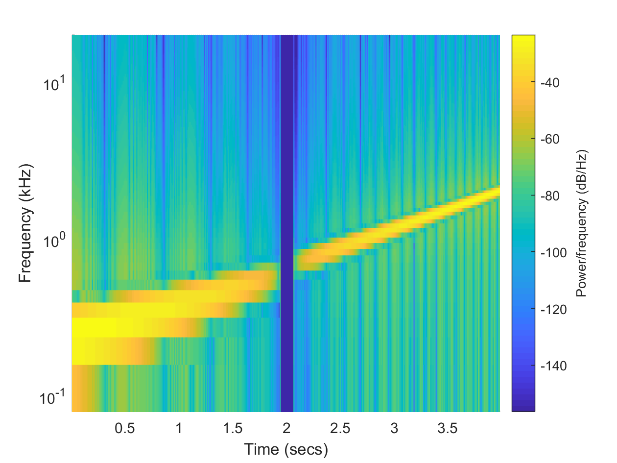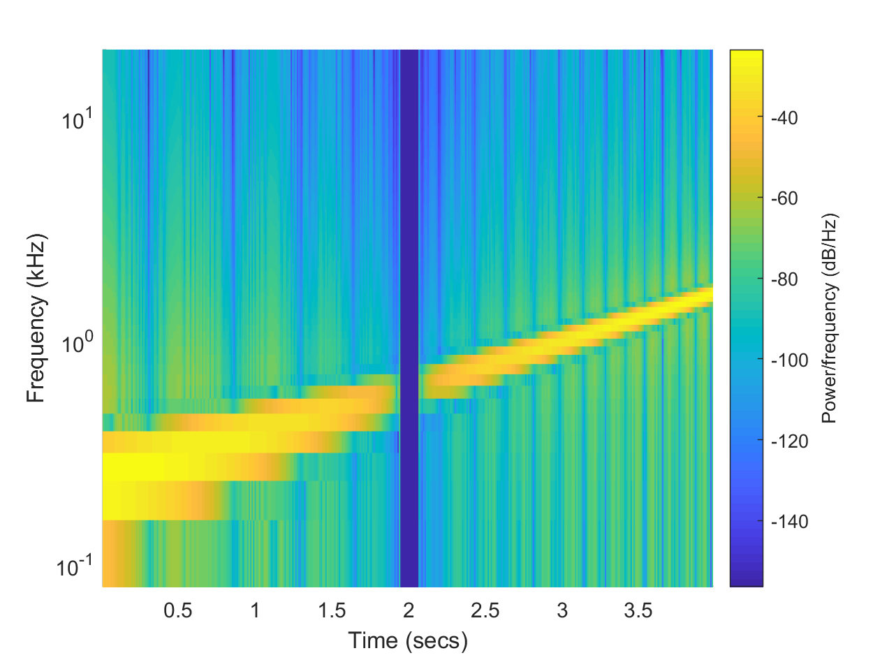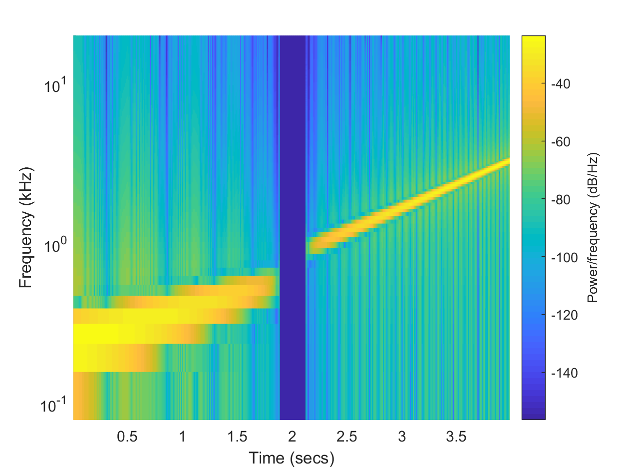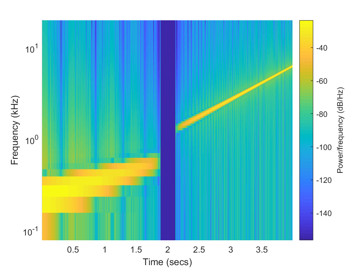 In order to induce this sense of continuity, we can mimic the shepard tones by using an amplitude envelope to create a 'gap' in the recording. We can do this by linearly decaying chirp1 to the 2 second mark, adding a silence of 125ms, then increasing the amplitude of chirp2.