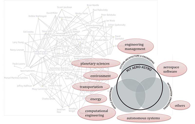 | AeroAstro's strategic growth into systems architecture and engineering, and information engineering began around 1997. It led to an increased emphasis on interdisciplinary fields, such as computational engineering and engineering management, as well as multi-disciplinary fields such as energy and environmental studies. In the background is a connectivity map of the department's research thrusts and faculty. (enlarge image) |  |