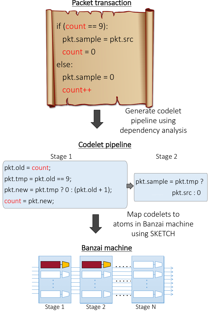 The compiler has two main steps. First, it goes from the sequential packet transaction provided by the programmer to a pipeline of codelets: small code fragments that, if run atomically, guarantee the packet transaction's semantics. This process requires us to track dependencies between different operations within the same packet transaction, and more importantly, different operations across different packet transactions (through state variables). Section 4.2 of the paper explains this in further detail.