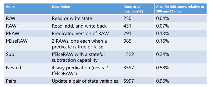 We went through some of our example programs, and identified stateful operations in them. We then created an atom covering these operations. For example, a bloom filter requires the ability to either read or write a bit in an array, but not the ability to read, add, and write back.