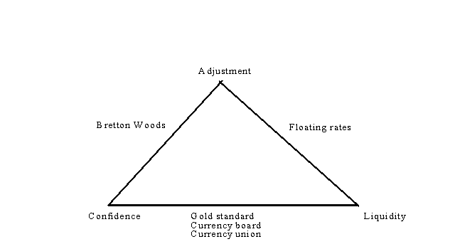 The essence of the dilemma may be understood by remembering the catechism first suggested by the Bellagio Group, the famous official-academic international talk shop that flourished in the 1960s. In the world according to Bellagio, the problem of choosing an international monetary regime could be summarized as the effort to achieve Adjustment, Confidence, and Liquidity. Exactly what these terms mean is somewhat in the eye of the beholder; but my version goes as follows. Adjustment means the ability to pursue macroeconomic stabilization policies - to fight the business cycle. Confidence means the ability to protect exchange rates from destabilizing speculation, including currency crises. Liquidity basically means short-term capital mobility, both to finance trade and to allow temporary trade imbalances.
