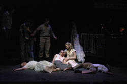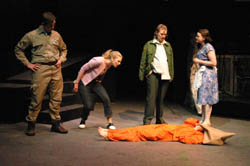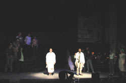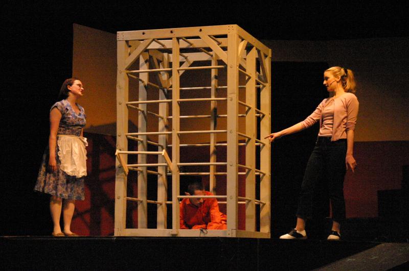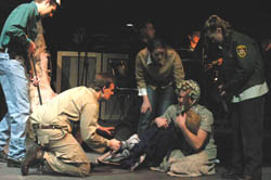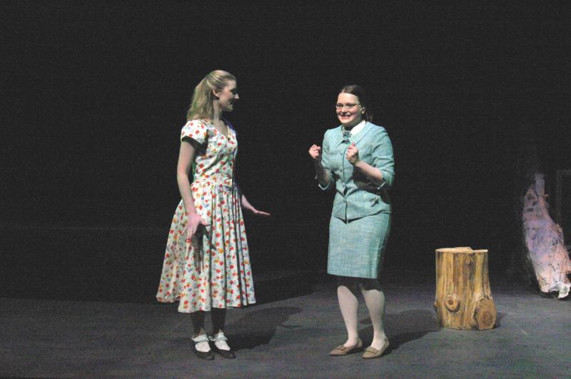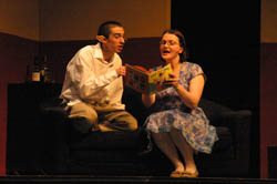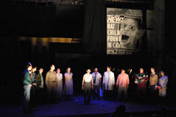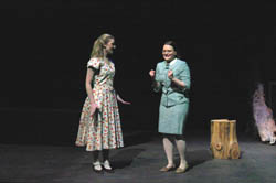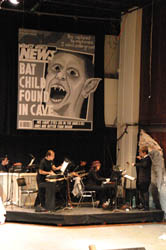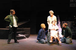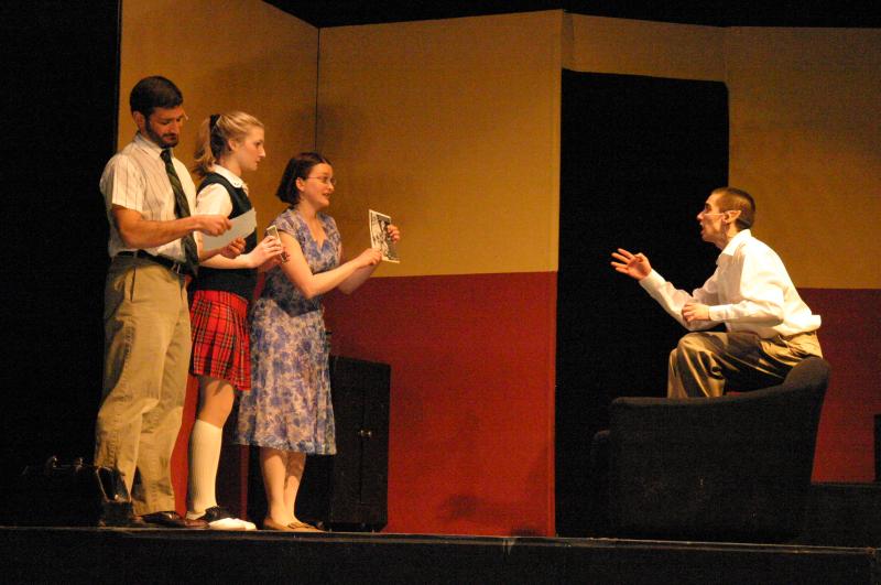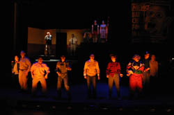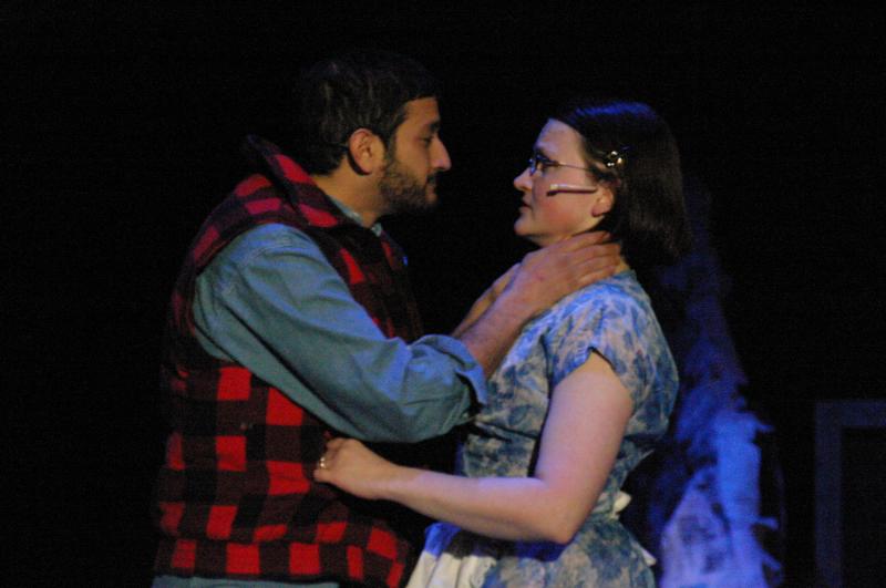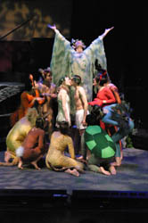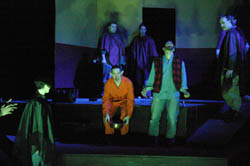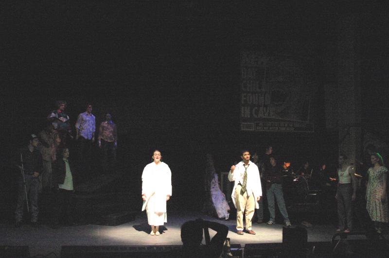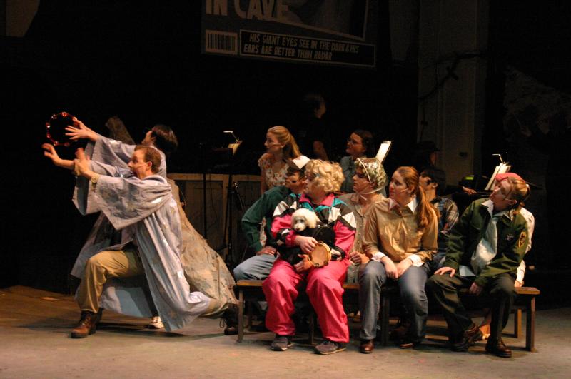 The Deputy (Joe Lowery, left) and Sheriff (Welkin Pope, green jacket) hand the Bat Boy (David Poland, in bag) to Shelley (Nori Pritchard) and Meredith (ML Peters, right). (credit: Jax Kirtley) Dr. Parker (Paul Giragos) reminisces with Meredith (ML Peters). (credit: Jax Kirtley) Meredith (ML Peters) teaches Edgar the Bat Boy (David Poland) to read. (credit: Jax Kirtley) The townspeople make "A Joyful Noise". (credit: Jax Kirtley) Dawn Erickson and Todd Radford take their vicious hunting dogs Muffin (as herself) and Mr. Princess Snugglebutt (Siris) on a hunt for the Bat Boy. (credit: Jax Kirtley) Edgar (David Poland) makes an "Apology to a Cow". (credit: Jax Kirtley) Shelley (Nori Pritchard, kneeling) comforts Edgar (David Poland) after the death of her parents. (credit: Jax Kirtley) DZ and the Joyful Noiz! (Jeremy Nimmer, Stephen Peters, Dennis Miaw, Sue Swalley, David Zych) (credit: Jax Kirtley) "Children, Children", with Pan (Joe Lowery, up center), Shelley and Edgar (Nori Pritchard and David Poland, center), surrounded by helpful forest creatures. And a lobster. (credit: Jax Kirtley) |