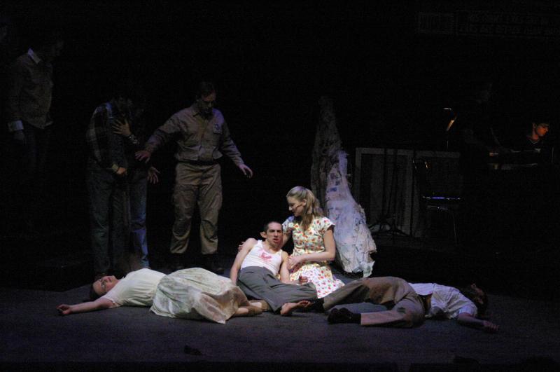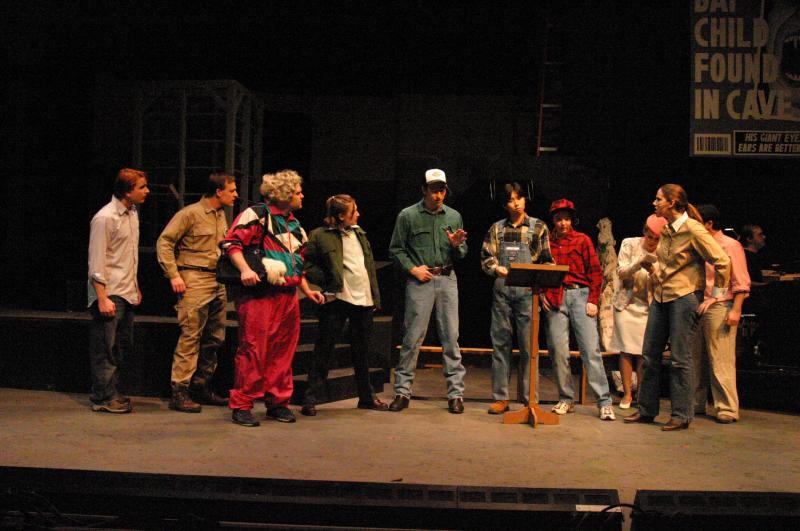 The Sheriff (Welkin Pope) takes custody of the Bat Boy from Rick (Pete Chambers) and Ron (Heather Doering). (credit: Jax Kirtley) The townspeople discuss "Another Dead Cow". (credit: Jax Kirtley) The Sheriff (Welkin Pope) listens on as Mrs. Taylor (TR Jordan, standing) comforts Ron (Heather Doering), Ruthie (Nicolina Akraboff), and Rick (Pete Chambers). (credit: Jax Kirtley) "Comfort and Joy" (credit: Jax Kirtley) Shelley (Nori Pritchard) and Meredith (ML Peters) plan a "Three Bedroom House". (credit: Jax Kirtley) Shelley (Nori Pritchard) and Edgar (David Poland) share a tender moment in the woods. (credit: Jax Kirtley) The townspeople argue the fate of Edgar. (credit: Jax Kirtley) Rev. Hightower (Noelani Kamelamela) tries to heal the Bat Boy (David Poland). (credit: Jax Kirtley) Soundmaster Monty (credit: Jax Kirtley) |