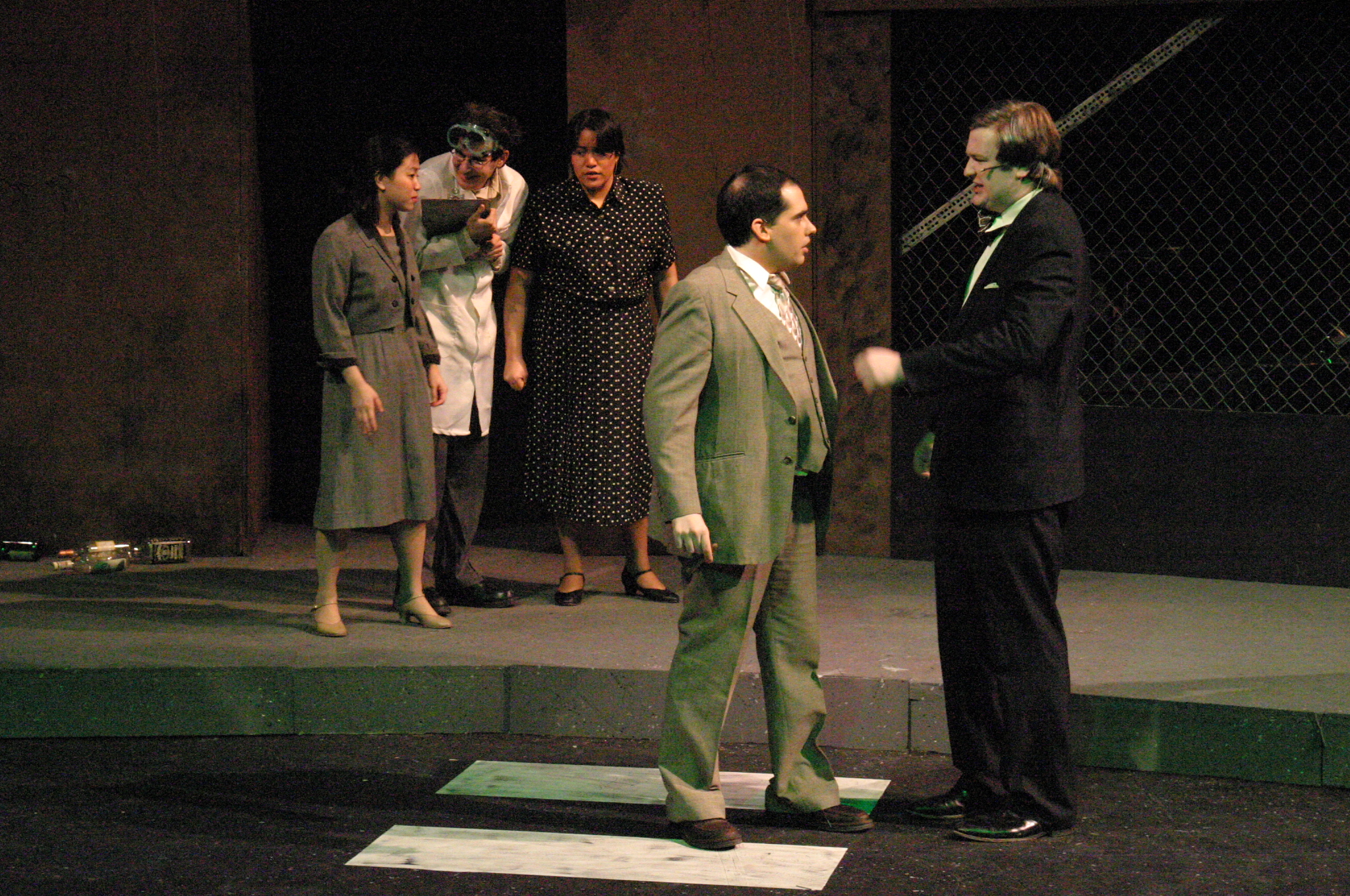 Senator Fipp (Greg Lohman) confronts Caldwell Cladwell (Darrell Cain) as Caldwell's staff (Maria Duaime, Pancho Vargas, Noe Kamelamela) look on. (credit: Jax Kirtley)