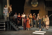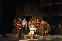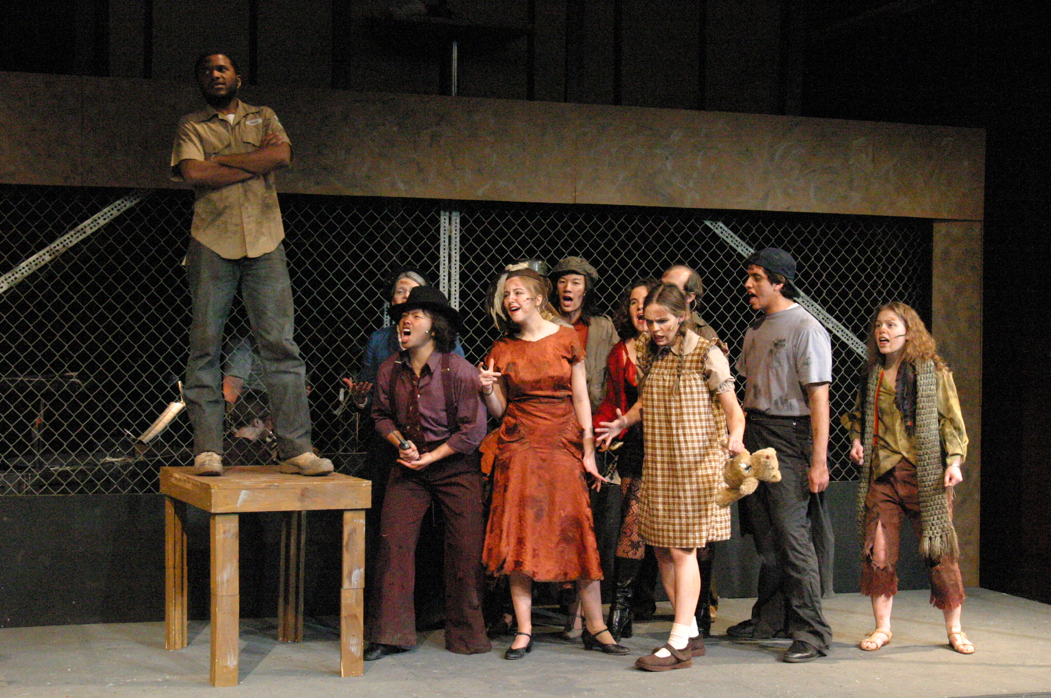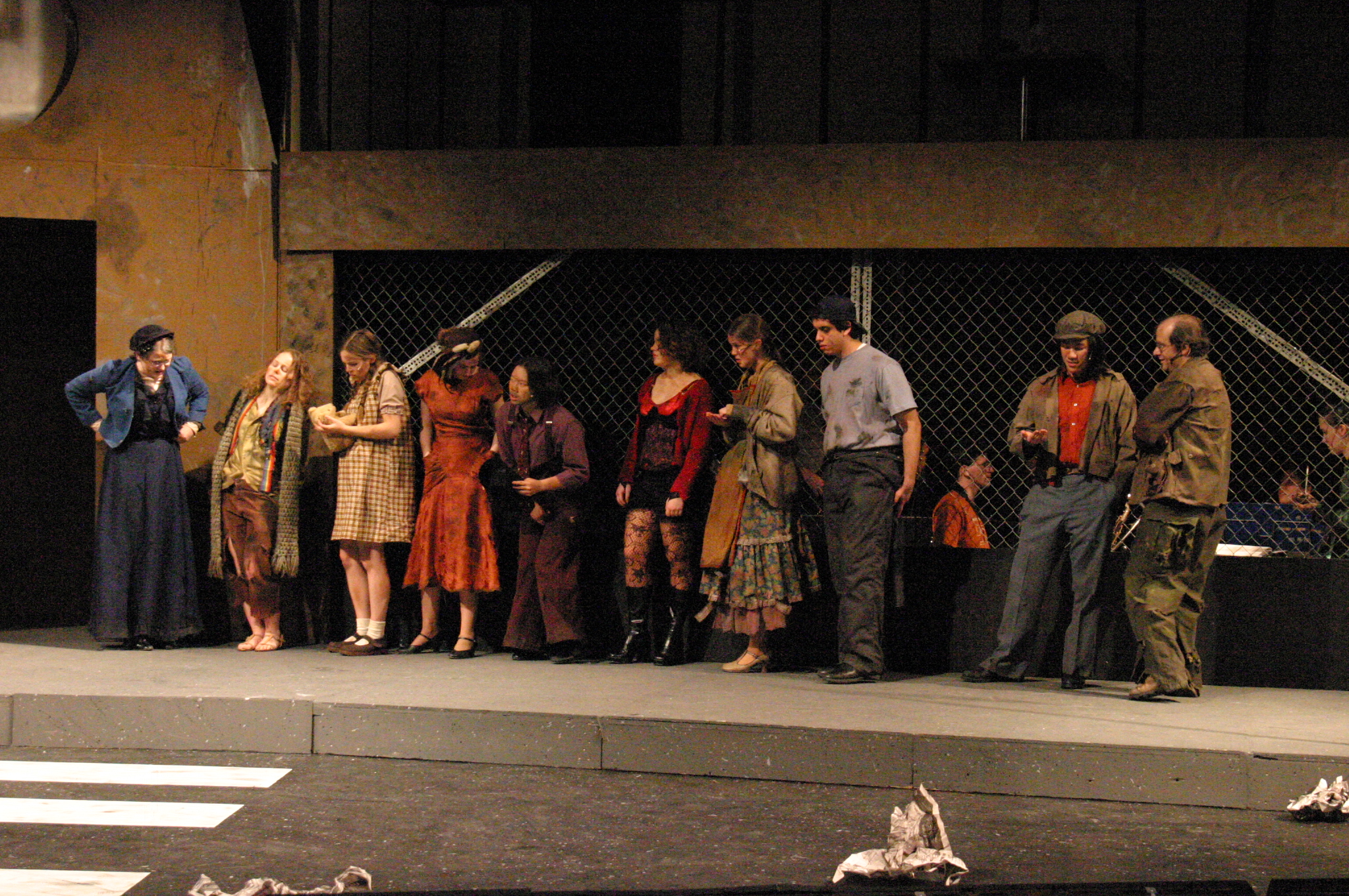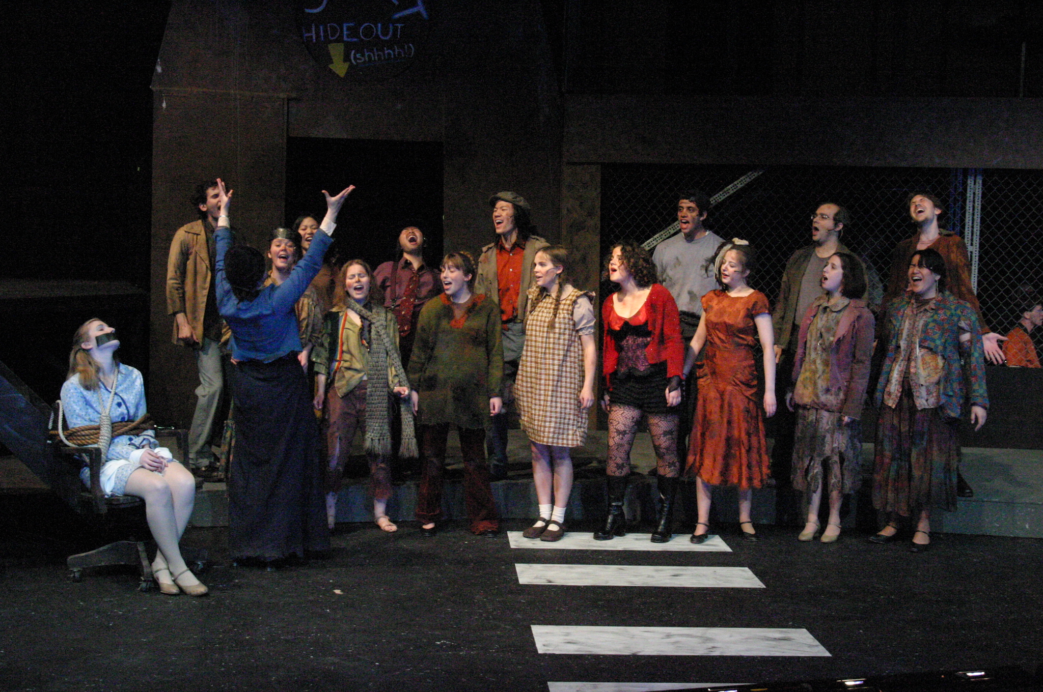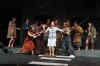 The Poor surround the captured Hope (Nori Pritchard) as they ask "What Is Urinetown?" (credit: Jax Kirtley)
