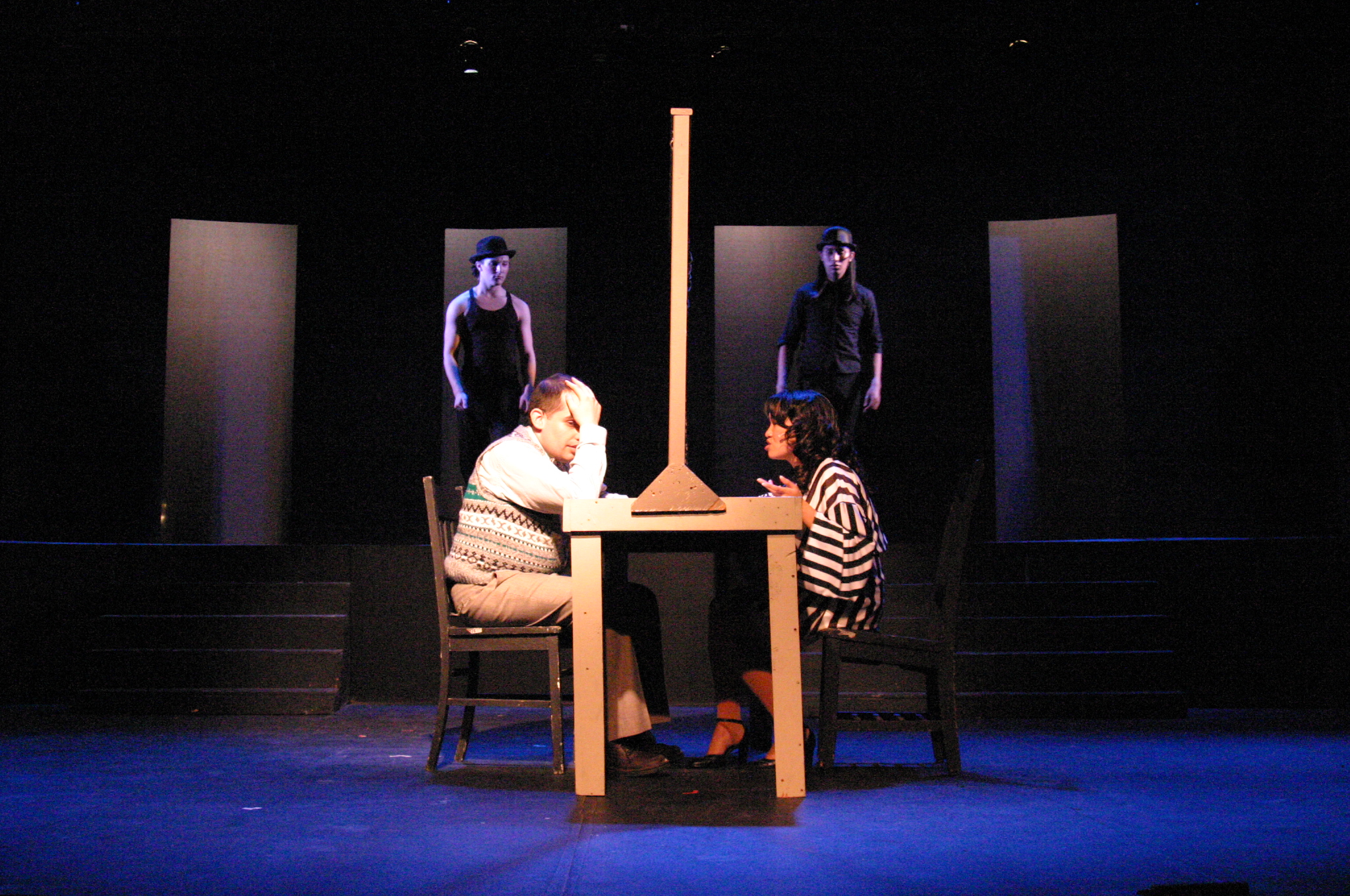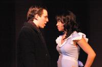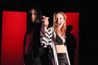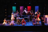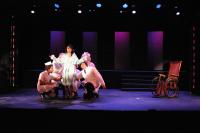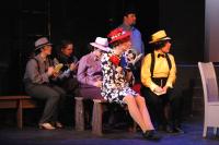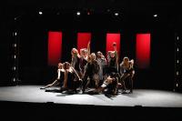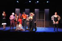 Murderess Anne (Amelia Thomas, right) describes her unfaithful husband (Milo Martinez) in the "Cell Block Tango" (credit: Jax Kirtley) "Cell Block Tango": Gabrielle Abousleman, Sally Peach, Kelsey Contreras, Amanda Giermann, Nori Pritchard, Krista Sergi, Nikki Akraboff, Dawn Erickson, Amelia Thomas (credit: Jax Kirtley) Billy and Roxie (Matthew Ciborowski, Isa de Castro, center) hold a press conference in "Both Reached for the Gun" (credit: Jax Kirtley) Amos (Greg Lohman) is "Mister Cellophane" (credit: Jax Kirtley) The audience of reporters at Roxie's trial (from left: Krista Sergi, Nikki Akraboff, Sally Peach, Thom Dancy, J. Michael Spencer, Dawn Erickson) (credit: Jax Kirtley) Mary Sunshine (Thom Dancy) (credit: Jax Kirtley) |