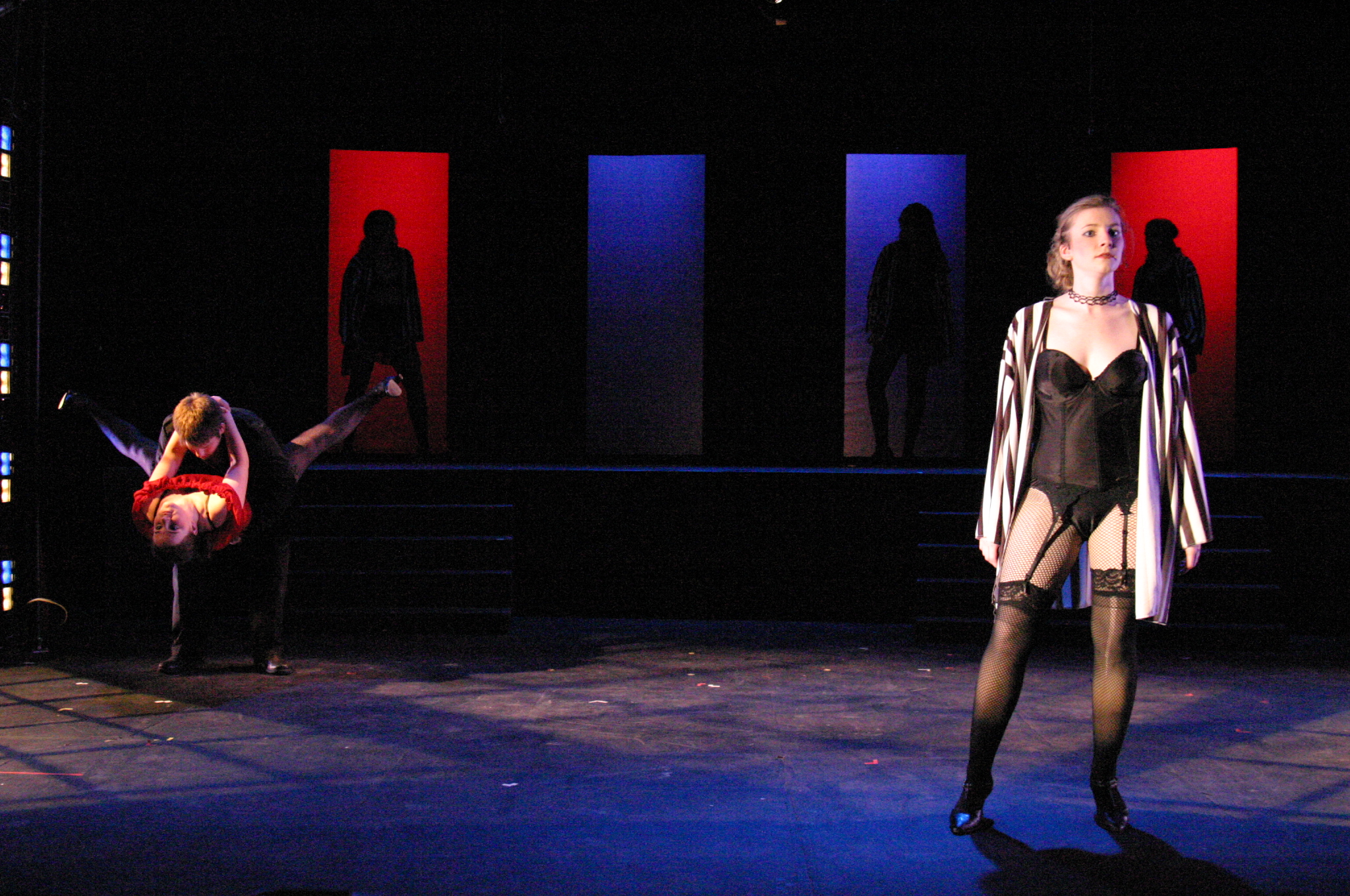 Velma Kelley (Nori Pritchard) in "All That Jazz" (credit: Jax Kirtley) "Number 17 -- The Spread Eagle": Sally Peach, Matt Stern, and Nori Pritchard (credit: Jax Kirtley) "All I Care About is Love": Billy Flynn (Matthew Ciborowski) surrounded by his chorus (Gabrielle Abousleman, Nikki Akraboff, Sally Peach, Amanda Giermann, Kelsey Contreras, Amelia Thomas, Dawn Erickson, Krista Sergi) (credit: Jax Kirtley) Roxie and her crack medical team of doctors and nurses (from left: Milo Martinez, J. Michael Spencer, Isa de Castro, Matt Maranda, Carlos Cardenas, Edmund Golaski) in "My Baby and Me" (credit: Jax Kirtley) "Razzle Dazzle" (credit: Jax Kirtley) Velma and Mama (Nori Pritchard and Michelle Fogerson) listen to Roxie's trial and comment on the lack of "Class" (credit: Jax Kirtley) |