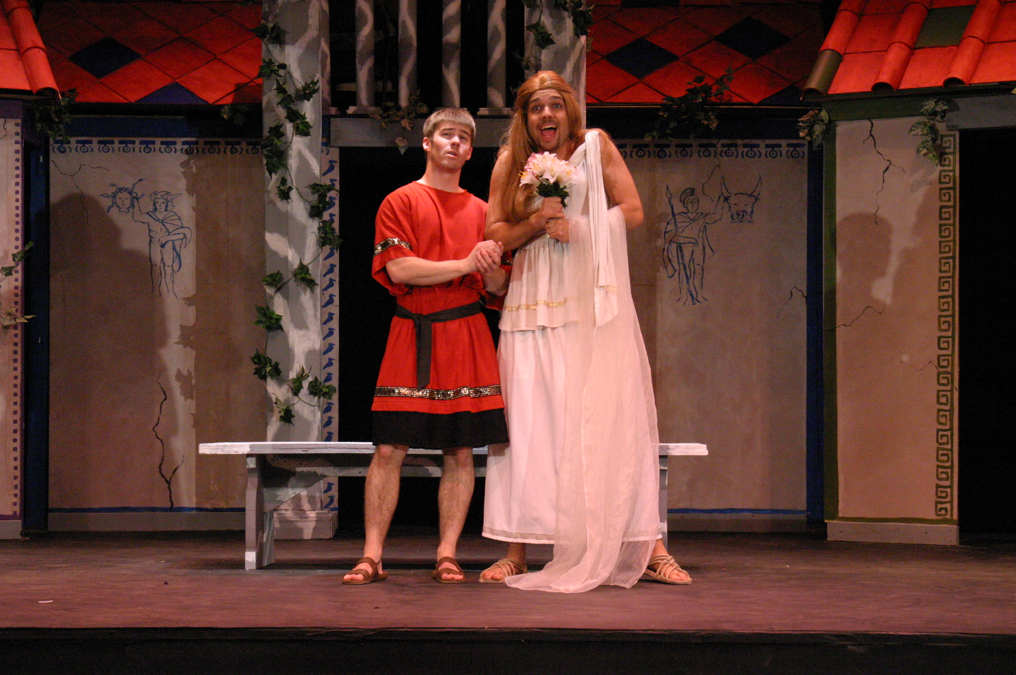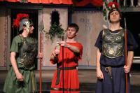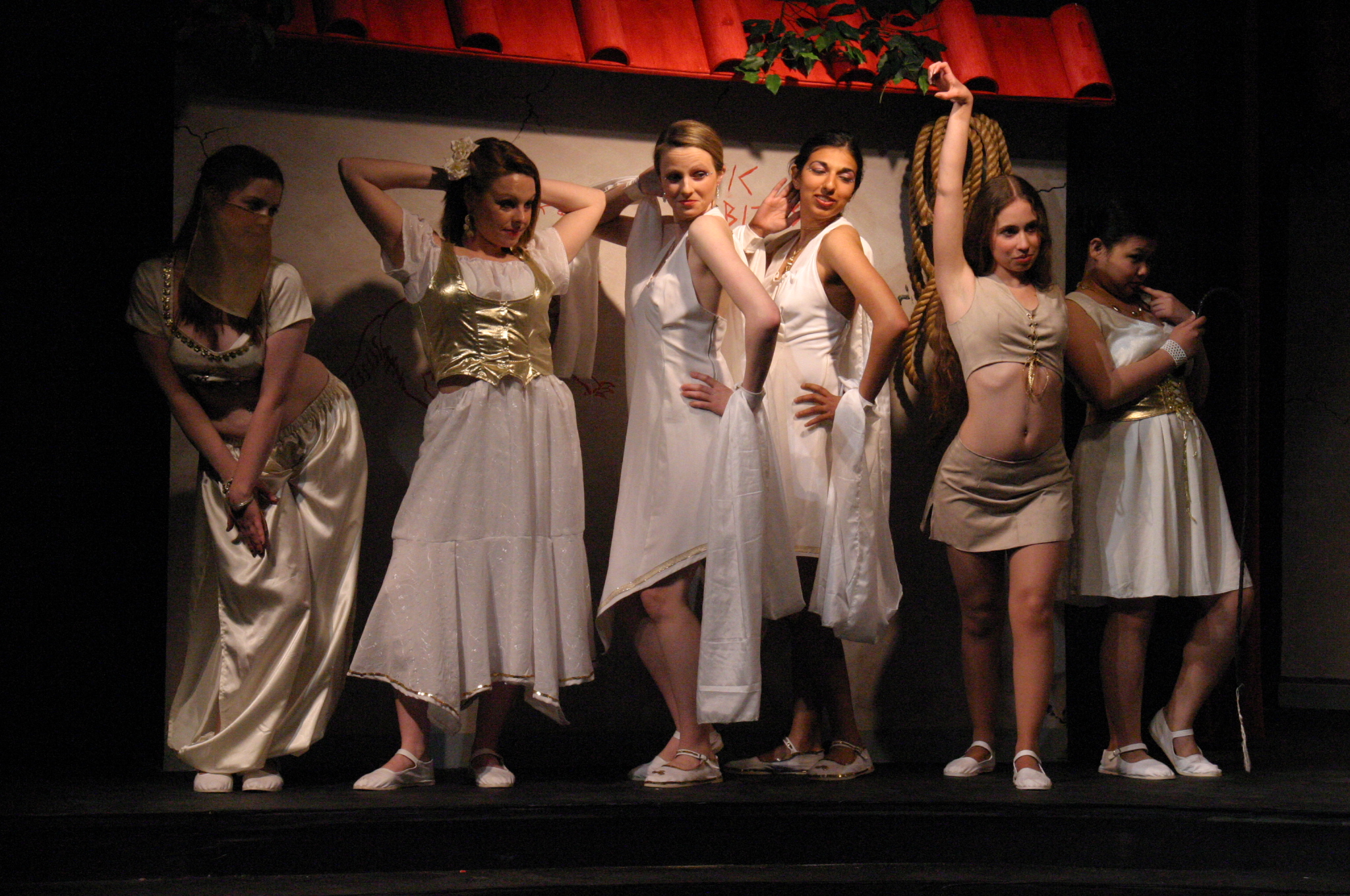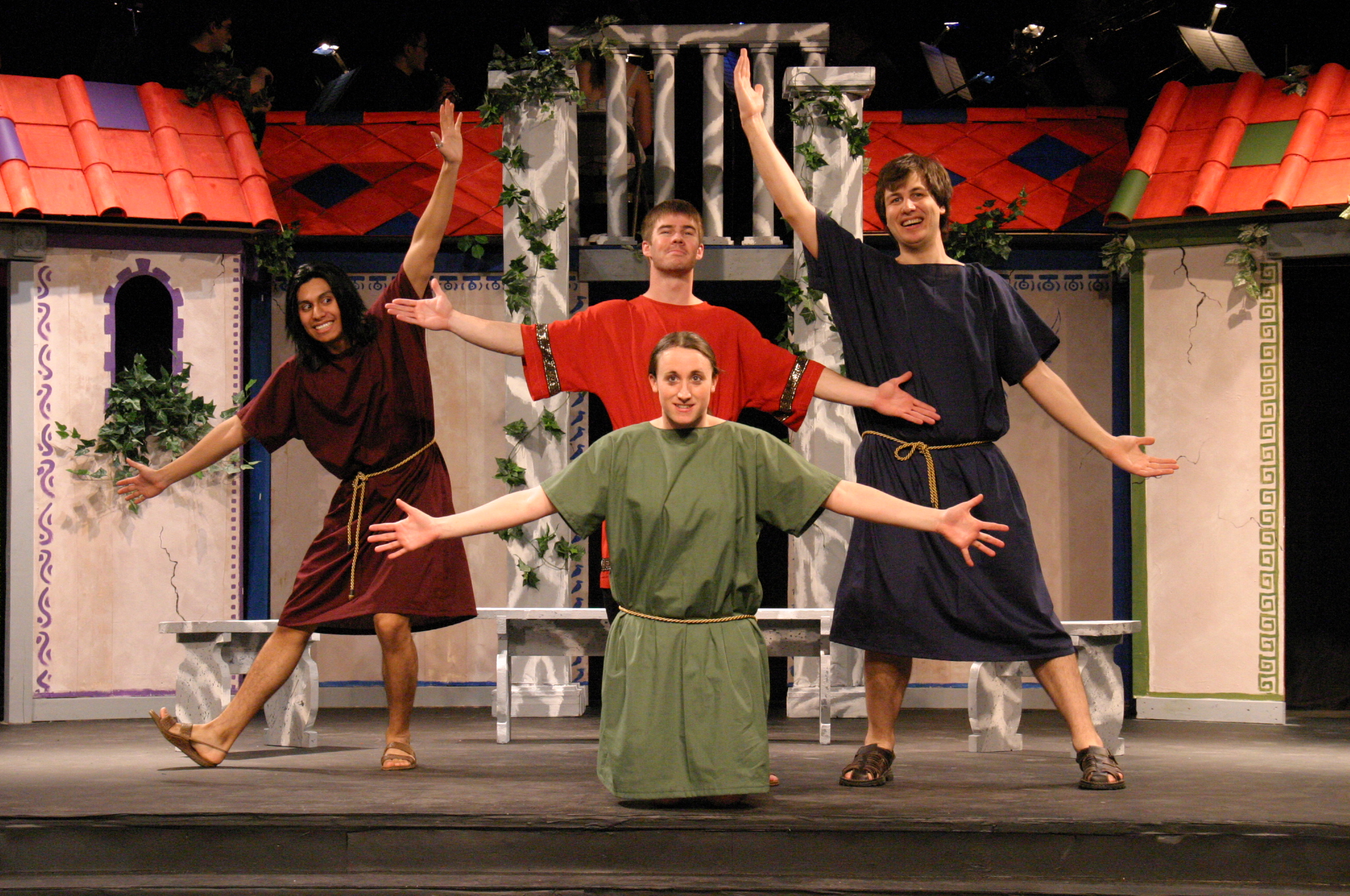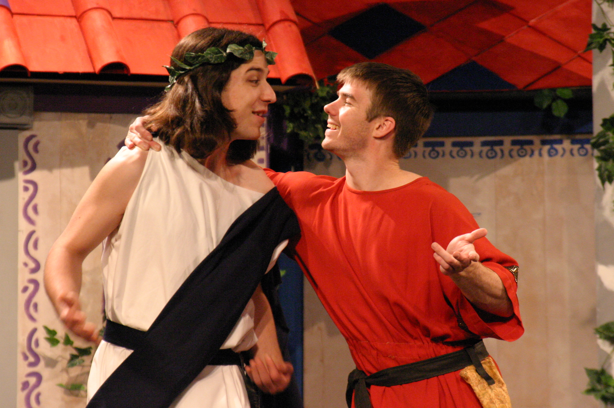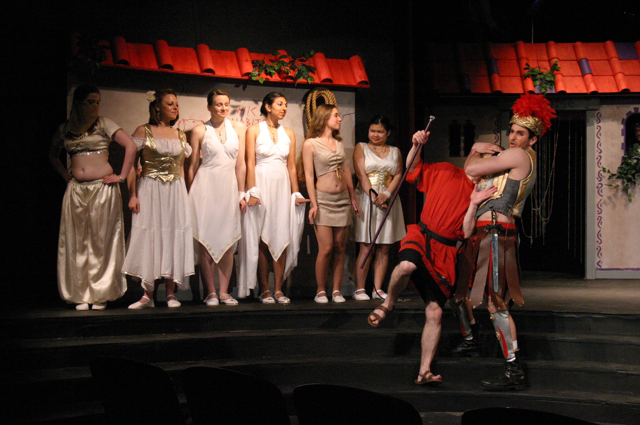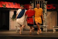 Hero (Yonatan Arie Gray '10) and Pseudolus (Tim Abrahamsen '06) discuss love and freedom. (credit: Jax Kirtley) Tintinabula (Janet Lieberman '07) demonstrates her assests to Marcus Lycus (Bill Andrews '06) and his staff (Milo Martinez '08, Armen Babikyan, and Nicole O'Keefe '09), Pseudolus (Tim Abrahamsen '06), and Hero (Yonatan Arie Gray '10). (credit: Jax Kirtley) Pseudolus (Tim Abrahamsen '06) paints a 'Pretty Little Picture' for Hero (Yonatan Arie Gray '10) and Philia (Kathleen McEnnis '07). (credit: Jax Kirtley) Pseudolus (Tim Abrahamsen '06) pretends to be a soothsayer and sends Erronius (Steven Flowers '06) on a long walk -- with help from Hysterium (Daniel Perez '10). (credit: Jax Kirtley) The courtesans (Janet Lieberman '07, Tara Jewett, Shannon Nees '07, Aparna Ramanathan '07, Sarah Slotznick '09, and Theresa Eugenio '07) watch Miles Glorious (Misha Leybovich G) give Pseudolus (Tim Abrahamsen '06) an emphatic hello. (credit: Jax Kirtley) Philia (Kathleen McEnnis '07) waits on the roof for orders from her captain. (credit: Jax Kirtley) Miles Gloriousus (Misha Leybovich G) prepare for a funeral -- of sorts. (credit: Jax Kirtley) |
