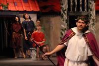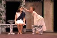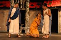 Hysterium (Daniel Perez '10) get a little more grovelling in before his masters Senex (Greg Lohman G) and Domina (Elvie Stephanopoulos '07) leave for her mothers. (credit: Jax Kirtley) Marcus Lycus (Bill Andrews '06) and his staff (Milo Martinez '08, Armen Babikyan, and Nicole O'Keefe '09) get ready to show Pseudolus (Tim Abrahamsen '06) his inventory. (credit: Jax Kirtley) Young lovers Hero (Yonatan Arie Gray '10) and Philia (Kathleen McEnnis '07) are interrupted by Slave-in-Chief, Hysterium (Daniel Perez '10). (credit: Jax Kirtley) Erronius (Steven Flowers '06) is kept from his house by Hysterium (Daniel Perez '10). (credit: Jax Kirtley) The courtesans (Janet Lieberman '07, Tara Jewett, Shannon Nees '07, Aparna Ramanathan '07, Sarah Slotznick '09, and Theresa Eugenio '07) strike a professional pose. (credit: Jax Kirtley) Domina (Elvie Stephanopoulos '07) explains to Hysterium (Daniel Perez '10) her feelings for her husband. (credit: Jax Kirtley) Pseudolus (Tim Abrahamsen '06) get Hysterium (Daniel Perez '10) all dolled up for the captain. (credit: Jax Kirtley) |