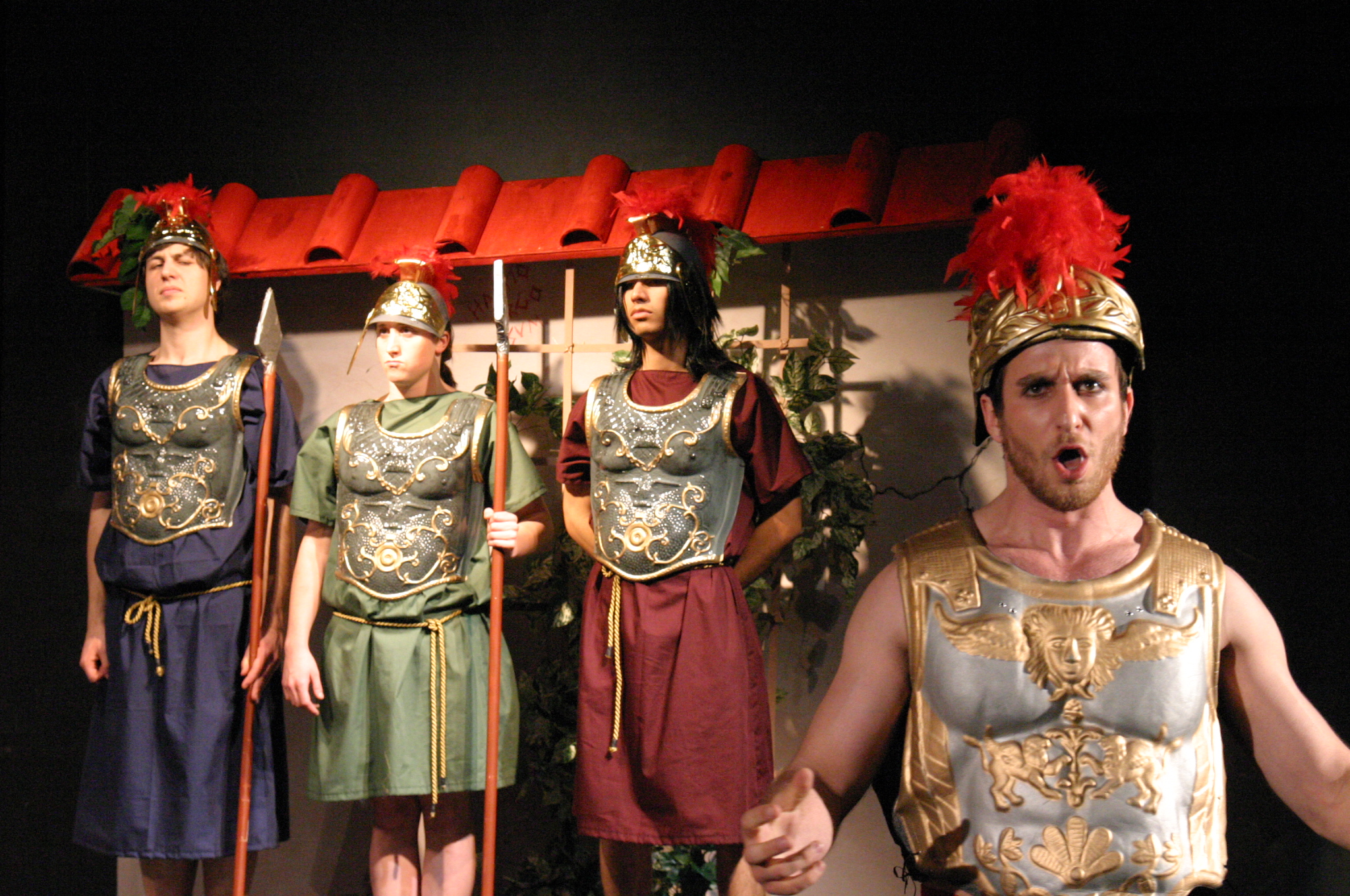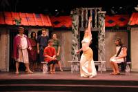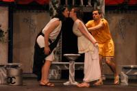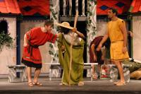Pseudolus (Tim Abrahamsen '06) and the Proteans (Milo Martinez '08, Nicole O'Keefe '09, and Armen Babikyan) introduce us to a 'Comedy Tonight'. (credit: Jax Kirtley) Introducing Marcus Lycus (Bill Andrews '06). (credit: Jax Kirtley) Vibrata (Sarah Slotznick '09) demonstrates her assests to Marcus Lycus (Bill Andrews '06) and his staff (Milo Martinez '08, Armen Babikyan, and Nicole O'Keefe '09), Pseudolus (Tim Abrahamsen '06), and Hero (Yonatan Arie Gray '10). (credit: Jax Kirtley) Senex (Greg Lohman G), Pseudolus (Tim Abrahamsen '06), and Hysterium (Daniel Perez '10) declare that 'Everybody Ought to Have a Maid' (credit: Jax Kirtley) Soldiers (Nicole O'Keefe '09 and Armen Babikyan) show Peudolus (Tim Abrahamsen '06) the contract for Phila. (credit: Jax Kirtley) Milos Gloriousus (Misha Leybovich G) and his Soldiers (Armen Babikyan, Nicole O'Keefe '09, and Milo Martinez '08) introduce Miles Gloriousus. (credit: Jax Kirtley) Philia (Kathleen McEnnis '07) shows Hero (Yonatan Arie Gray '10) how she will get back at her captain in 'That'll Show Him'. (credit: Jax Kirtley) In the end, it is a 'Comedy Tonight'. (credit: Jax Kirtley) |