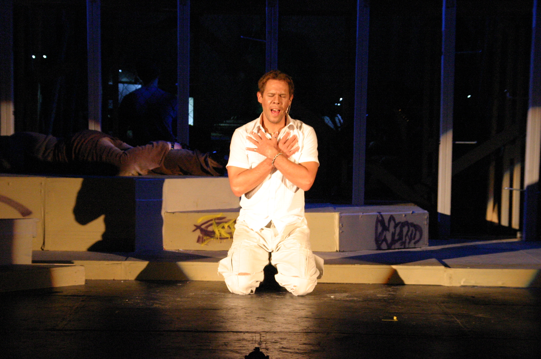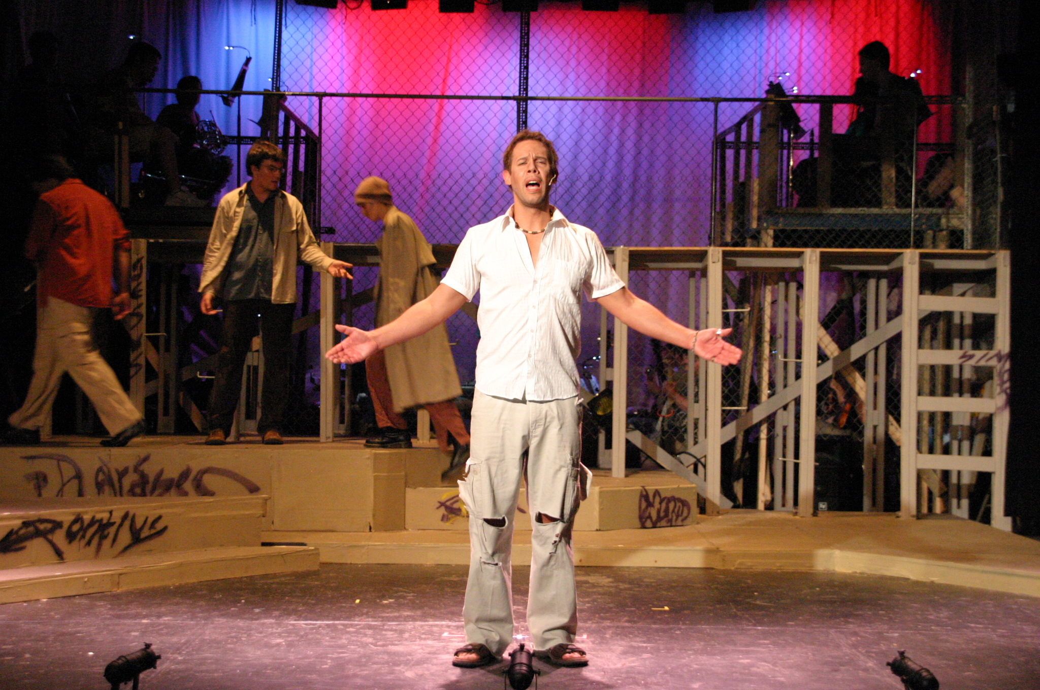 Heaven on Their Minds - Rich Fulkerson (credit: Jax Kirtley'96) Strange Thing Mystifying - Rich Fulkerson, Kevin Brown (credit: Jax Kirtley'96) This Jesus Must Die - Daniel Ruiz, Luis Loya '06, Hubert Hwang '07, Josh Marcus, Matt Peairs '09 (credit: Jax Kirtley'96) The Temple - (foreground) Luis Loya '06, Dawn Erickson '07 (background) Tori Root, JB Parkes '13, Sally Guthrie '13, Jasmine Florentine '11, Emily Rosser '12, Sally Peach '09, Daniel Ruiz, Greg Lohman PhD '07, Helen O'Keefe '09, Rachel Bowens-Rubin '11, Josh Marcus, Hubert Hwang '07, Matt Peairs '09 (credit: Jax Kirtley'96) Damned for All Time - Daniel Ruiz, Rich Fulkerson, Luis Loya '06, Hubert Hwang '07, Josh Marcus, Matt Peairs '09 (credit: Jax Kirtley'96) The Last Supper - (clockwise from far left) Luis Loya '06, Dawn Erickson '07, Rich Fulkerson, JB Parkes '13, Carrie Lee '10, Kevin Brown, Daniel Ruiz, Helen O'Keefe '09, Rachel Bowens-Rubin '11, Josh Marcus, Jasmine Florentine '11, Betsy Flowers '12, Tori Root, Emily Rosser '12, Sally Guthrie '13 (credit: Jax Kirtley'96) The Arrest - Sally Guthrie '13, Emily Rosser '12, Tori Root, Rachel Bowens-Rubin '11, Josh Marcus, Kevin Brown, Helen O'Keefe '09, Jasmine Florentine '11, JB Parkes '13, Betsy Flowers '12, Dawn Erickson '07 (credit: Jax Kirtley'96) Pilate and Christ - (foreground) Brad Smith, Kevin Brown (middleground) Daniel Ruiz, Josh Marcus, Luis Loya '06, Matt Peairs (background) Daniel Ruiz, Rachel Bowens-Rubin '11, Sally Peach '09, Tori Root, Sally Guthrie '13, Betsy Flowers '12, Helen O'Keefe '09, Emily Rosser '12 (credit: Jax Kirtley'96) Could We Start Again Please? - JB Parkes '13, Carrie Lee '10 (credit: Jax Kirtley'96) Superstar - (foreground) Rich Fulkerson (balcony) Dawn Erickson '07, Daniel Ruiz, Tori Root (middleground) Sally Guthrie '13, Emily Rosser '12, Helen O'Keefe '09, Jasmine Florentine '11, Rachel Bowens-Rubin '11, Sally Peach '09 (credit: Jax Kirtley'96) |