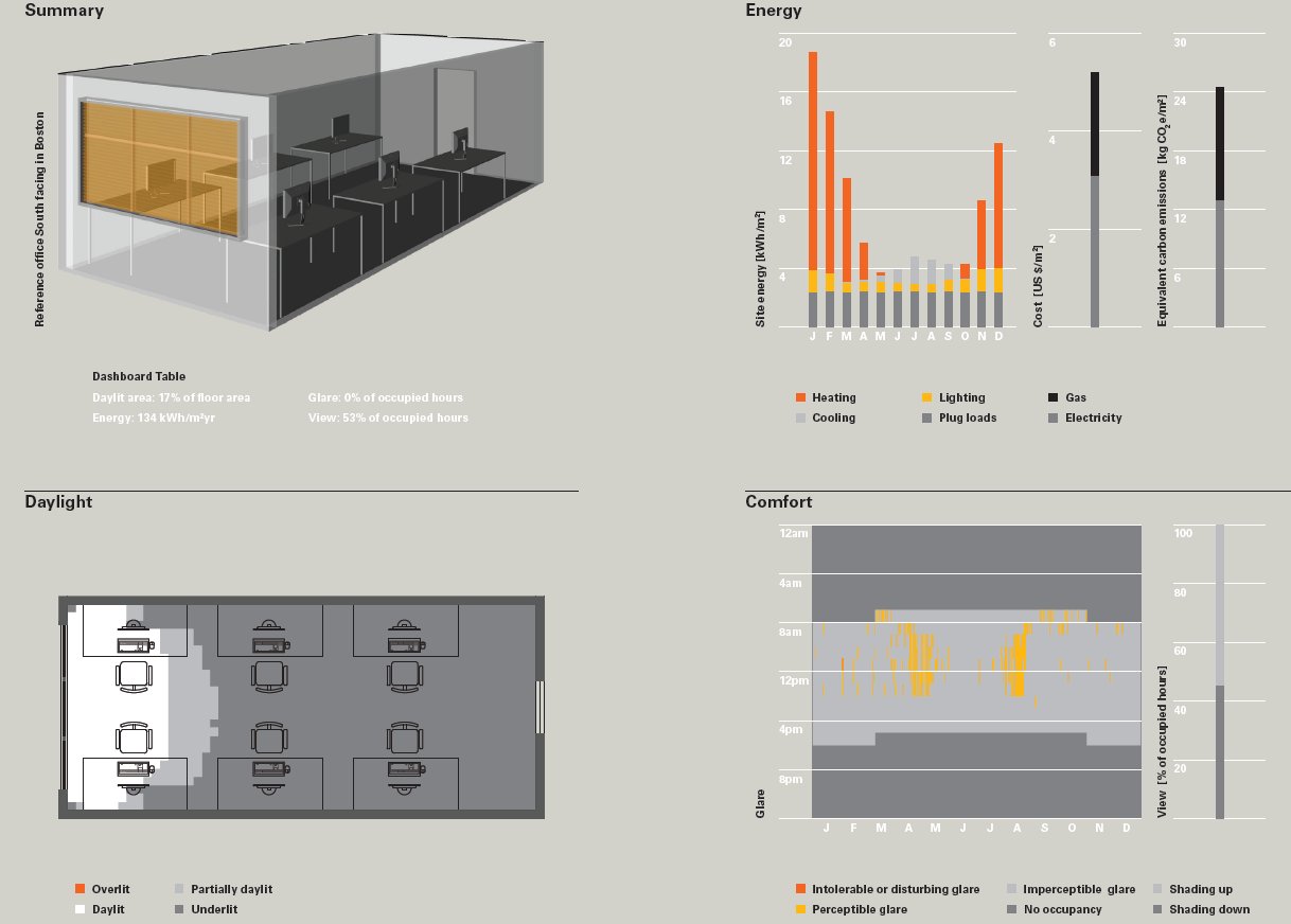 We are proposing a modeling and analysis convention for a side- and/or toplit space called the ‘reference office’. The reference office is meant to act as a baseline for comparative analyses of different façade and/or electric lighting technologies and may be used in research (facilitating the comparison of results from multiple studies) in practice (for product rating) as well as in architectural education (enabling students to contrast their design ideas to a set of standard design solutions). The reference office represents a somewhat typical ‘shoebox’ model as is commonly used for conceptual design explorations. The shoebox is comparatively ‘deep’, more than three times the window head height, so that the impact of light redirecting façade technologies can be resolved. Venetian blinds are manually controlled to avoid discomfort glare throughout the office. A Dashboard view of the Reference office is shown below.