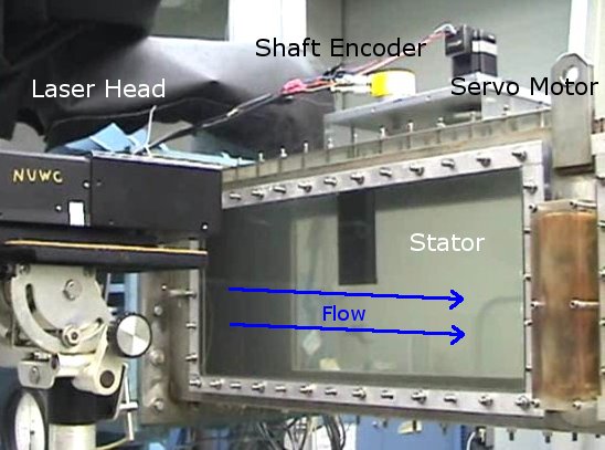 Small-scale experiments carried in a low speed open-channel water tunnel at MIT and high-speed experiments carried out in a closed-channel water tunnel at the Newport Naval Undersea Warfare Center (NUWC) in Newport, RI, show that tail articulation can have a beneficial effect on the unsteady flowfield behind a stator. The image below shows the experimental setup used to obtain Laser PIV data for high-speed flow field observation.