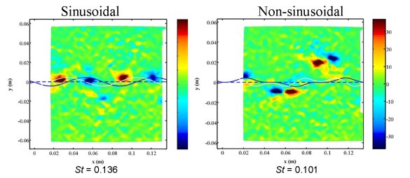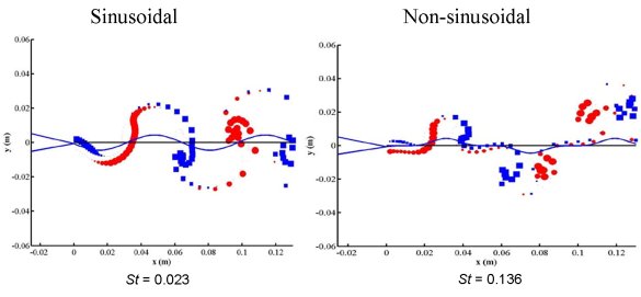 The experiments showed that the most efficient tail articulation seemed occur at certain Strouhal numbers (St), which is a non-dimensionalized frequency of the flowfield. At low St, the stator generated vortex sheet moves in a quasi-steady fashion with tail articulation. At moderate St, the vortext sheet begins to roll up, and at high St, the vortex sheets roll up into tight discrete vortices of alternating direction.