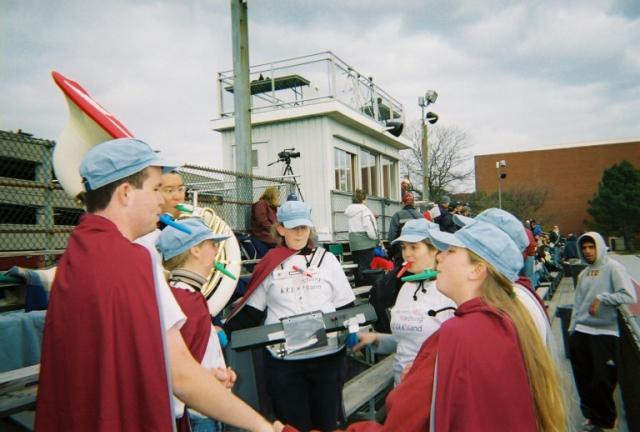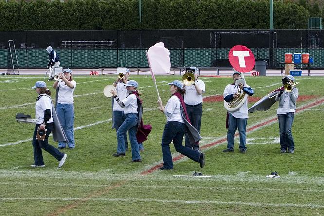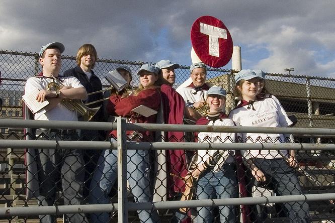 The Band premiered the new drumset cart/platform at a women's basketball game v. Springfield College. It was incredible. Also notice that our active membership increased by 50% since the last photo. Fantastic! Photo by Rachel Meyer 1/20/2007 |