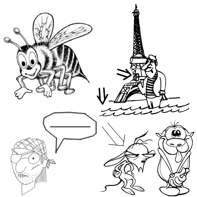 Each of these can be traded for a piece of an image (1 of 16, the image was broken into a grid 4 by 4) featuring a bumblebee, a Frenchman in front of the Eiffel Tower holding a glass of water next to water (with arrows pointing to both waters), a pirate with a blank word balloon, and a picture of Ren and Stimpy with an arrow pointing to Ren. See below. Pronouncing these, you get bee, eau, arr, Ren = B, O, R, N = BORN.