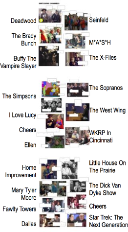 The dialogue in each scene refers to another classic scene from one of the other shows. You put the images into a chain, with Deadwood first as indicated by the yellow starburst, then the Fawlty Towers episode they're acting, then the West Wing episode they're acting, and so on. Index into each episode title to get the phrase BILL IN "A MAN IN NELL'S ROOM," which in that episode of the sitcom Nell is played by DANNY GLOVER.