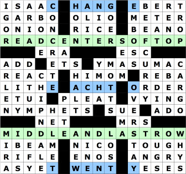 The clues are meaningless except for each of their words' first letters. Each answer is comprised of the initial letters of one word from its own clue, one from the next clue, and so on (wrapping around from the end of the Down clues back to the beginning of the Across clues). The words for each answer are shown in a single color in the clues below. After the grid is filled, the two long entries spell READ CENTERS OF TOP MIDDLE AND LAST ROW. The middle six letters of each spell CHANGE EACH TO TWENTY.