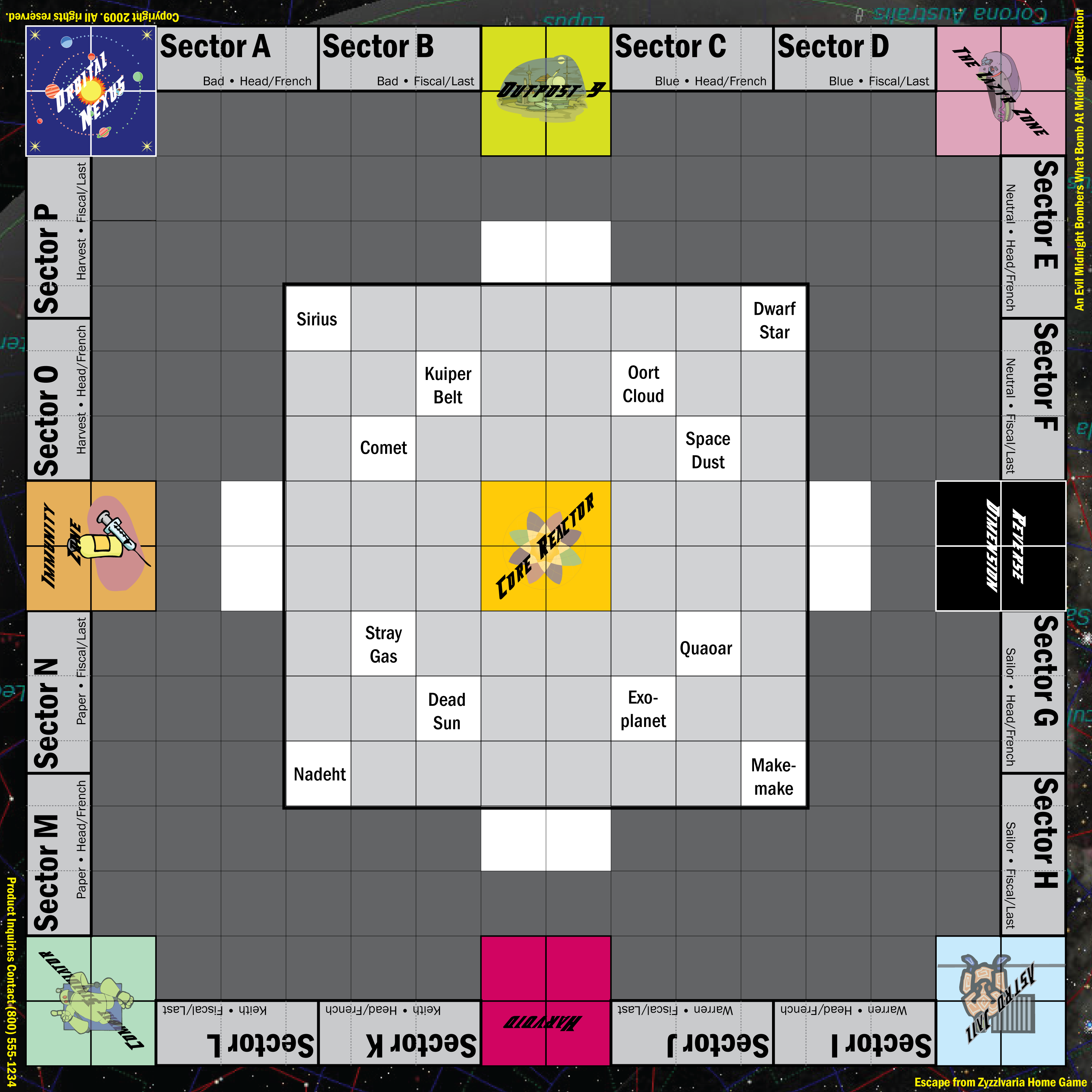 The last sentence encouraged them to bring their Collectible Disaster Response Sheets (awarded at the three events) and their game board.When the team met with Captain Blastoid in Lobby 7 (a.k.a. "Outpost 0"), they were handed the Black Box, a black jump drive which contained a simple web application. Upon activation, the application played a recording of the HAL-9000ish ship's computer, a set of directions which guided the team to Outpost 1, in Strobe Alley. They were also given icons indicating a set of three puzzles (from the Harvoid round) and a number corresponding to Algernon, who was ejected from the ship at the end of the recording. The team used a letter shared by the answers of those puzzles, Algernon's number, Algernon's Disaster Response Sheet, and elements of the surroundings to determine a password which activated the directions to Outpost 2. Abandoning a team member to remain behind as "Algernon," the team continued to follow the path.