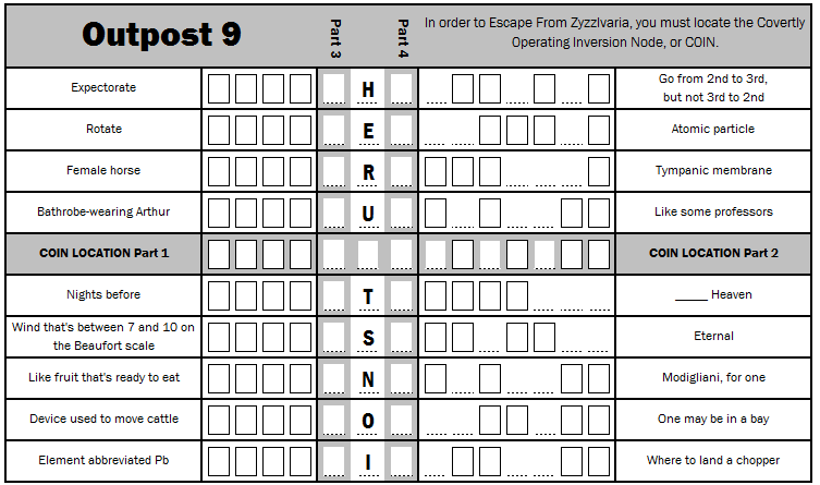 Upon arriving at Outpost 2, the recording ended again with three puzzle icons, but this time the team was given numbers for both Algernon and Harold. They then had to determine a password for Harold at Outpost 2, and also communicate with "Algernon" by phone to get a second password. This process continued through eight Outposts, with the team leaving behind seven crew members and entering up to seven passwords at a time before finally reaching Outpost 8, a location familiar to the team as Zyzzlvaria Alpha.