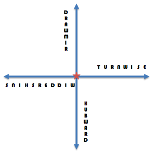 "The shape and cosmology of the disc system are perhaps worthy of note at this point. There are, of course, two major directions on the disc: Hubward and Rimward. But since the disc itself revolves at the rate of once every eight hundred days (in order to distribute the weight fairly upon its supportive pachyderms, according to Reforgule of Krull) there are also two lesser directions, which are Turnwise and Widdershins."—Terry Pratchett, The Colour of Magic