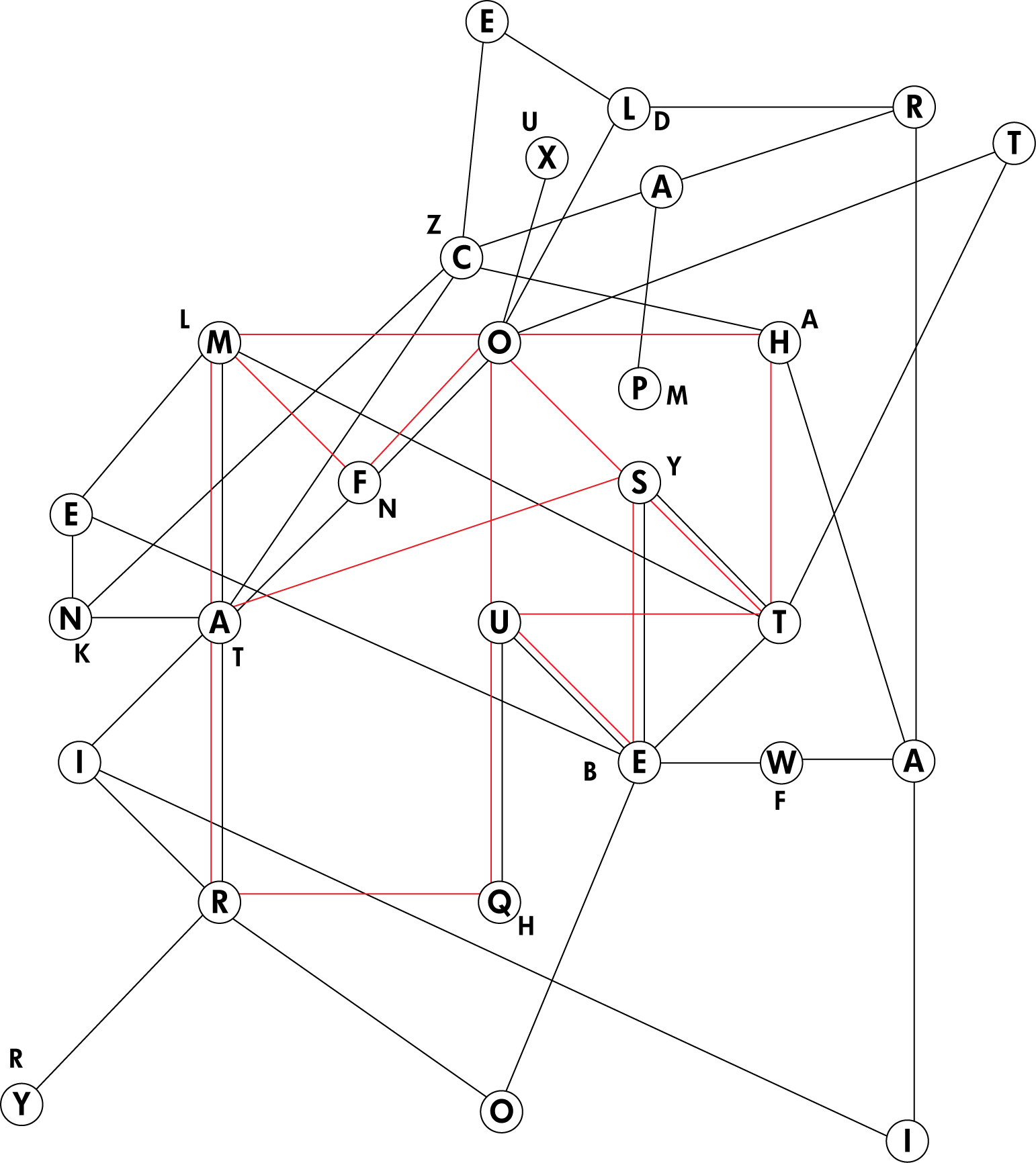 The red numbers give the length of the clue phrase that can be spelled out along the red paths only: MOST SOUTH OF MARQUESAS. The answer is FATU HIVA.