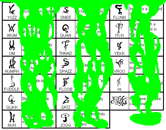 The Midston Alienfish is from On Beyond Zyzzlvaria. It whiles away its days reading books by its favorite author, like the ones below. We could read them too, except that our loonical lexicallography chart has been ruined by a sudden downpour of oobleck. You see, in Midston Alienfishese, characters don’t stand for letters—they stand for rules that are true about the words they’re in. The books will help you build the chart, the chart will help you build the books, so figure out the missing words, and you won’t get such funny looks!