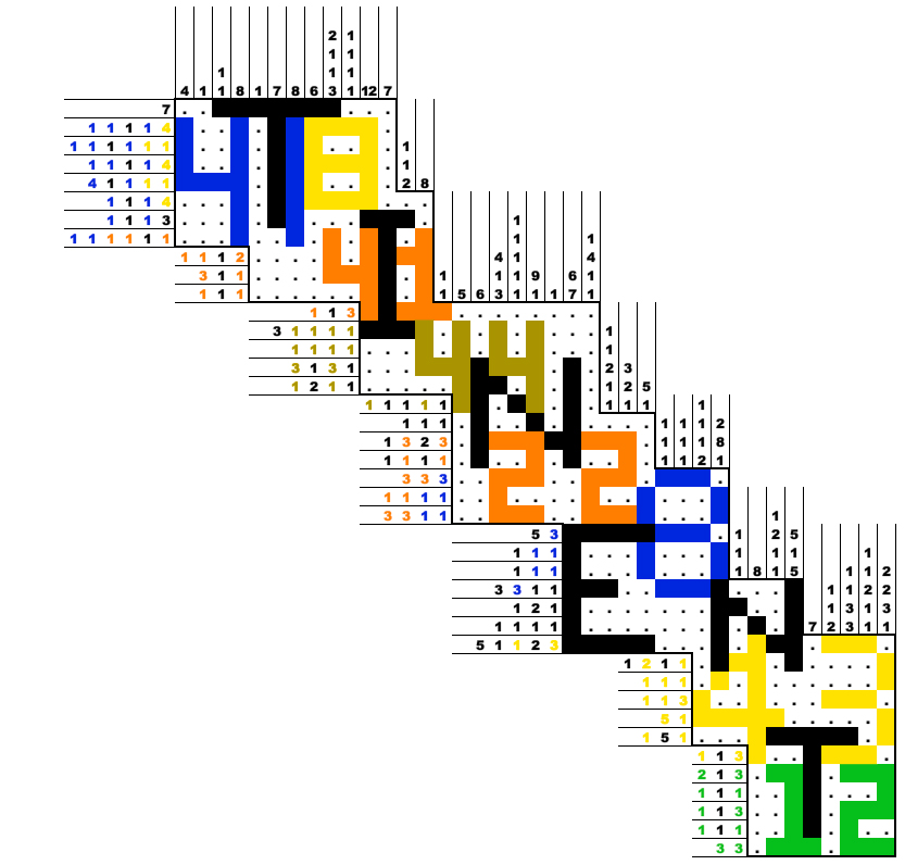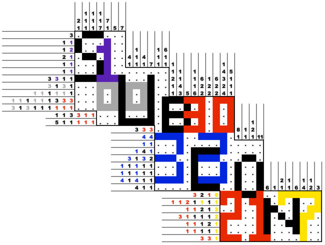 The companion half is a Paint-By-Number (Nonogram) variation. K-9 views the clues from the top, but like non-robotic canines he is colorblind, so he only reports consecutive black segments. Leela can see the different colors from the left, though they are not necessarily separated by white space. By solving the puzzles and assigning colors, you will see the Companion answer SUBCONTINENT in black letters. The colored numbers are the additional information for the Doctor half.