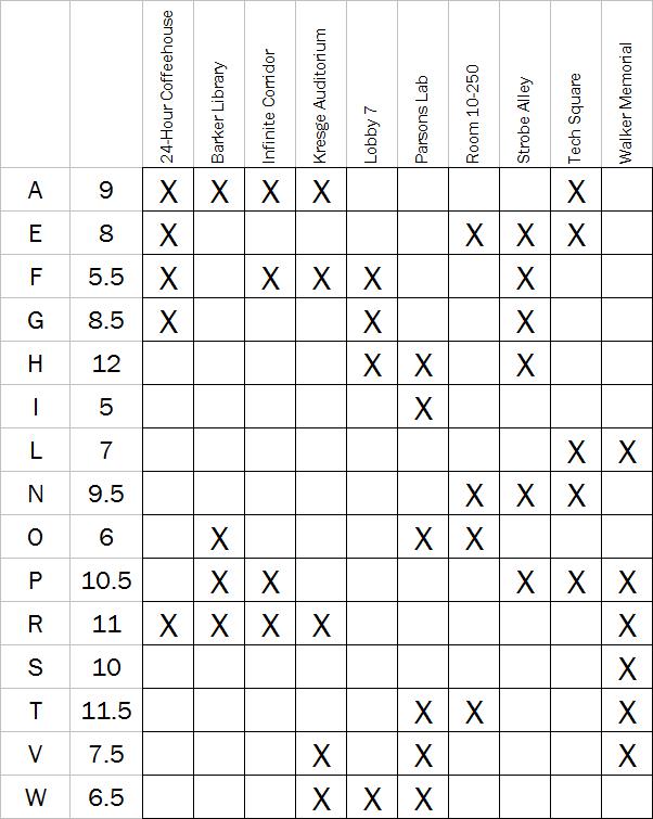Thora, Petulah and Silas hacked a place together. This cannot be Parsons or Room 10-250 (they are already covered in Silas's clue), Strobe Alley or Tech Square (Silas did not hack with Norm), Barker or Lobby-7 (all hackers accounted for), Infinite Corridor or Kresge (too many hackers already assigned). If it were the 24-hour coffeehouse, Silas would not fit anywhere in clue 2. So it is not the 24-hour coffeehouse, it is Walker, and we have now assigned all six Walker hackers. Icarus did not hack Walker or Strobe, so he hacked Parsons Lab.