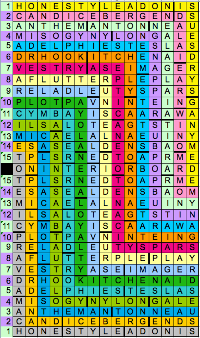 The answers to each clue cluster are 31 letters in total. They are placed upon the Lorentzian wormhole grid in the following manner: