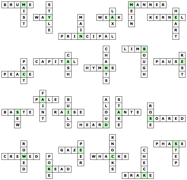 In the top grid, each pair of crossing words has two synonyms that have homophones that are synonyms of each other. These are placed in the blank grid to the right. The intersecting letters spell MY NAME CAN BE SAID AS WRECKS, which is a homophone of REX.