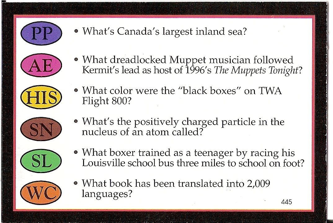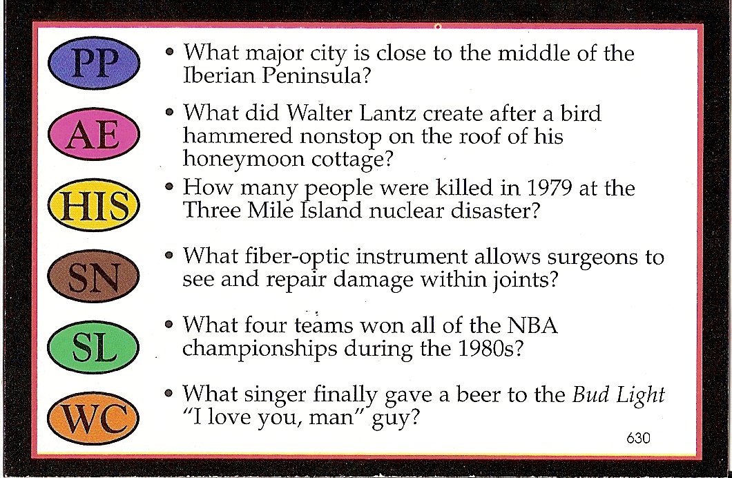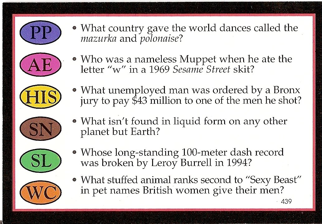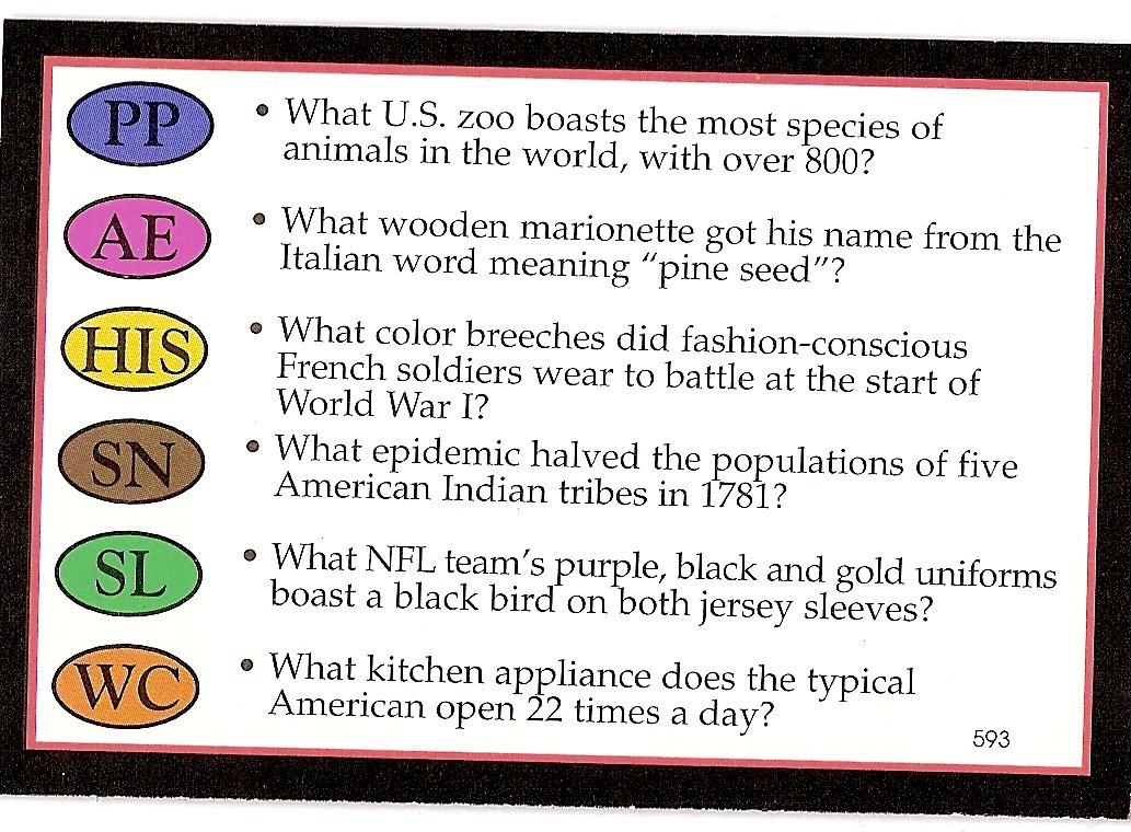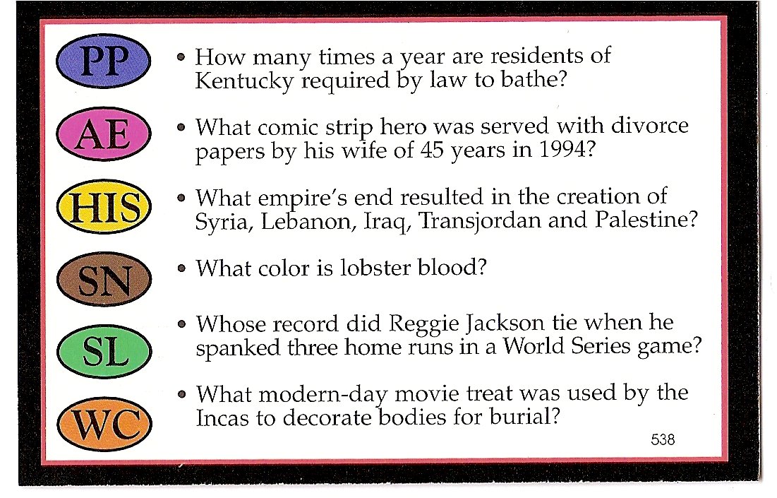 - Sports & Leisure answer, as given on the card, was incorrect at the time (20, 30, 1, 10)