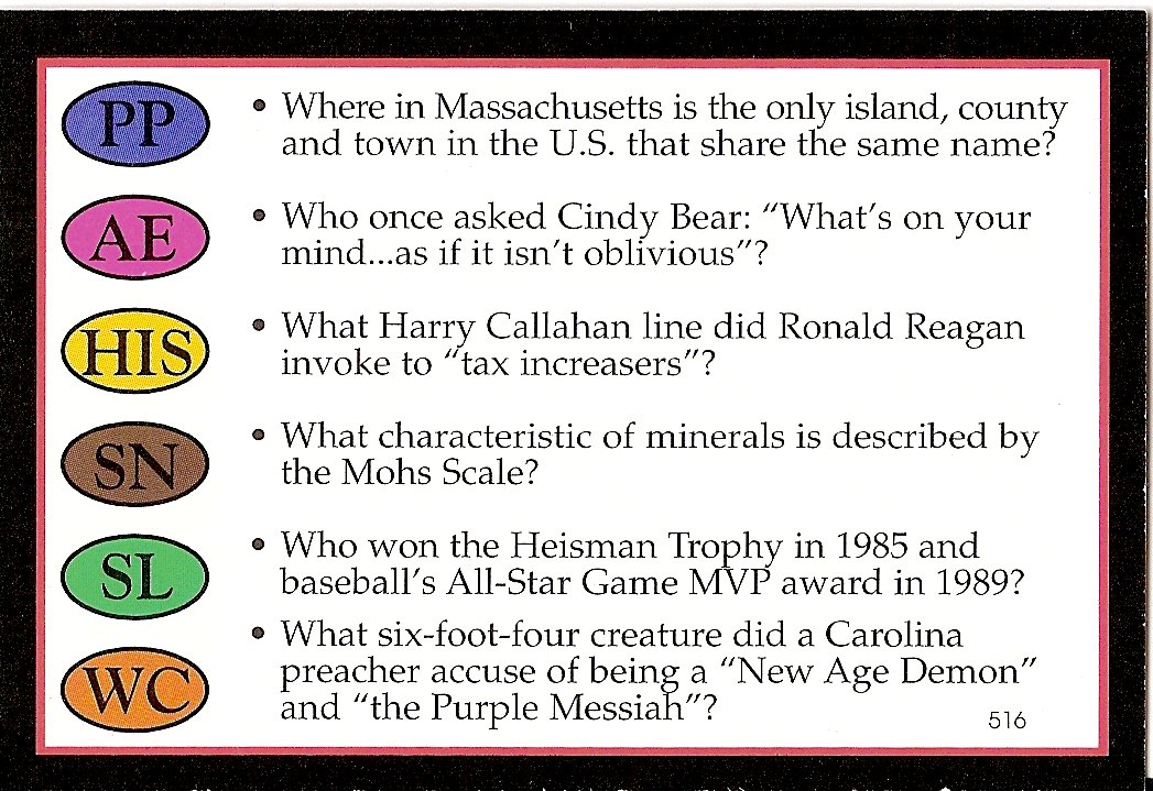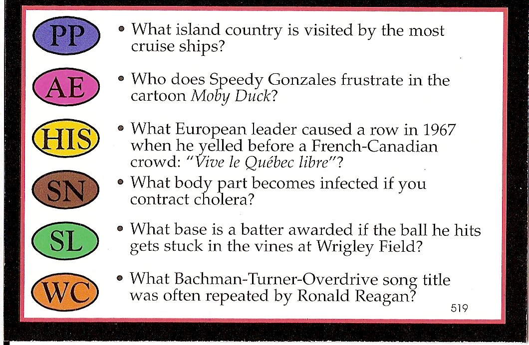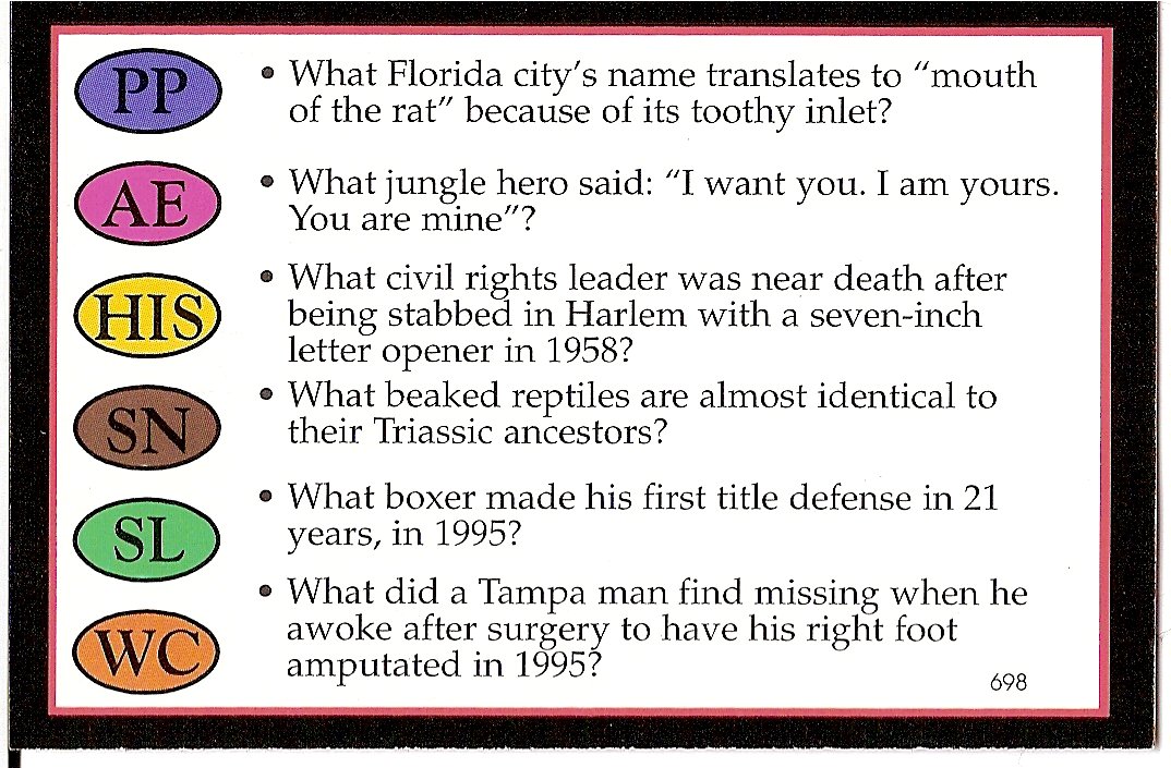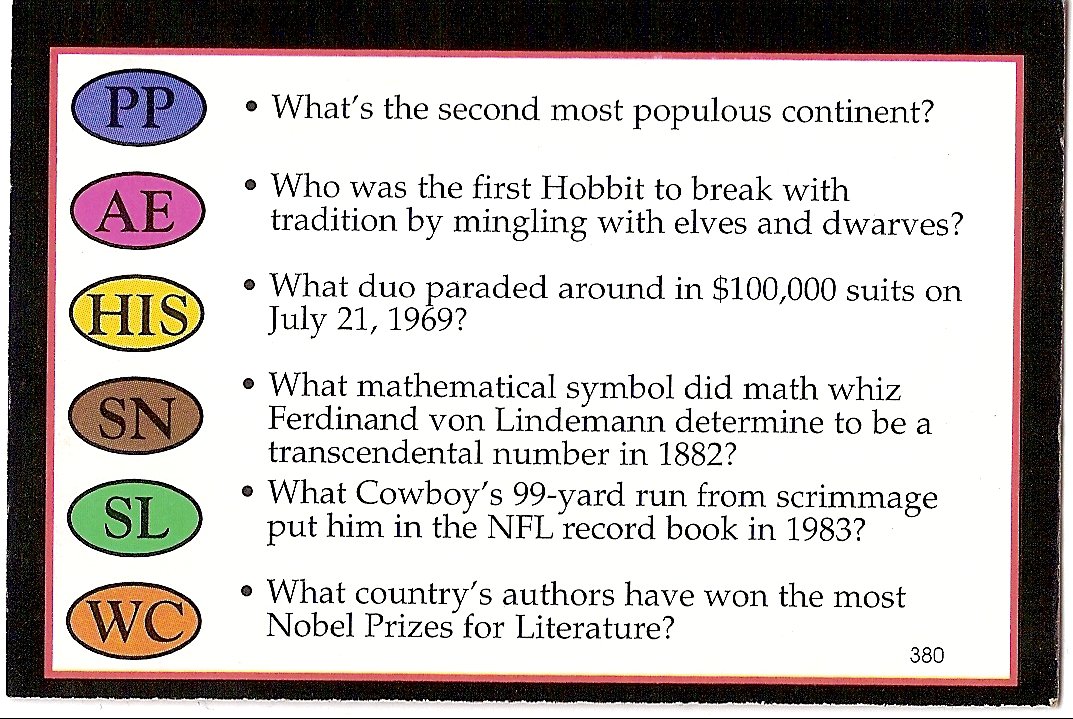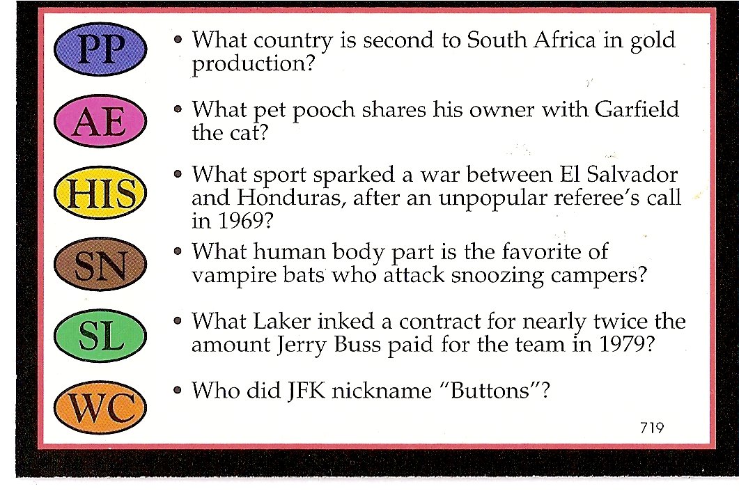 - Sports & Leisure answer, as given on the card, was incorrect at the time (20, 30, 1, 10)
