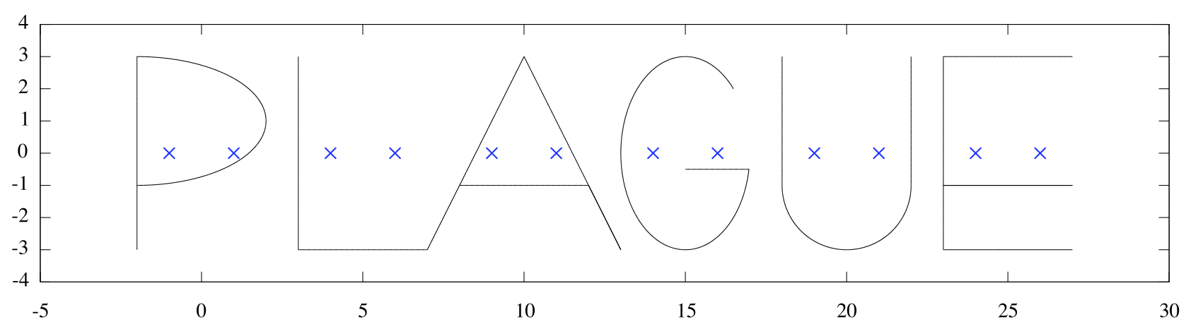 where the 6 paths have been horizontally displaced to be easier to see (lowest frequency on the left, highest on the right), and the locations of the listener's ears for each letter are marked with x's.