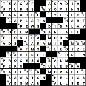 The given clues form the set of down clues for a diagramless 15x15 crossword puzzle with the usual symmetry (but, as noted below, with some unchecked letters). The structure of the grid and the answers to the clues can be determined in such a way that the numbering is correct and all of the across entries are actual words.