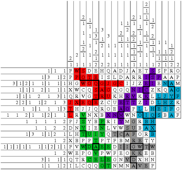 The letters in the initial grid can be ignored for now. Then, examination of the counts (especially cases like the 17th column) suggests that if it is to be a Paint-by-Numbers, blocks must be adjacent over the bars in the count lists, as is suggested by the formatting of the counts. The bars can then be drawn in the grid in the interiors of the shapes produced.