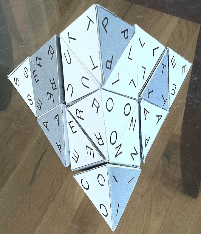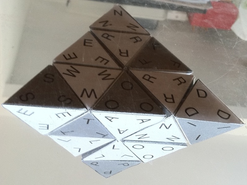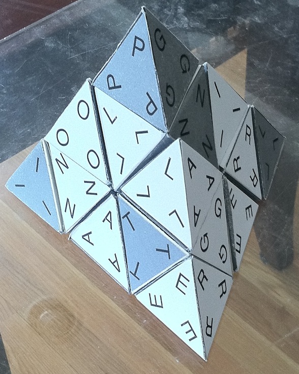 So what you have to do is assemble the Tetrahedronforce out of the pieces you're given, in such a way that faces that touch internally match in color, and three of the four faces of the Tetrahedronforce spell out the meta answers REGAL RING, CREATURES, and POLLINATE. When you do this, you'll find that each of the three meta answers begins at a different vertex of the Tetrahedronforce. If you look at the fourth face of the Tetrahedronforce and start at the fourth vertex and read the letters, you'll find they spell NERF SWORD, which is the answer to the supermeta.