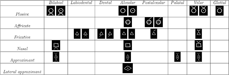 | Bilabial | Labiodental | Dental | Alveolar | Postalveolar | Palatal | Velar | Glottal | |