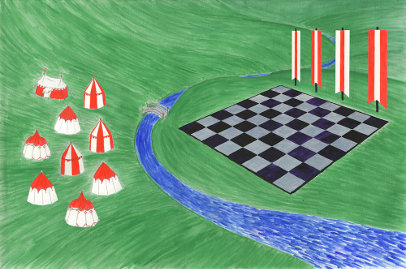 After a scenic ride on the Wonderland Express, you arrive at a station by a pleasant stream. On a nearby hill, you see a giant chessboard and what looks like an array of chessmen arranged on it. The Cat appears suddenly on the other side of the stream, eyeing the fish swimming in the brook. She takes her eyes away for long enough to notice you.