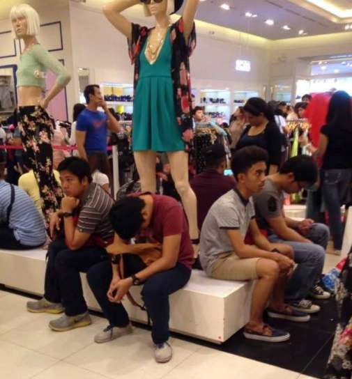 “The clump, or cluster, of bored, quietly enraged, mildly embarassed men waiting for their wives to come out of a changing room in a dress shop.”