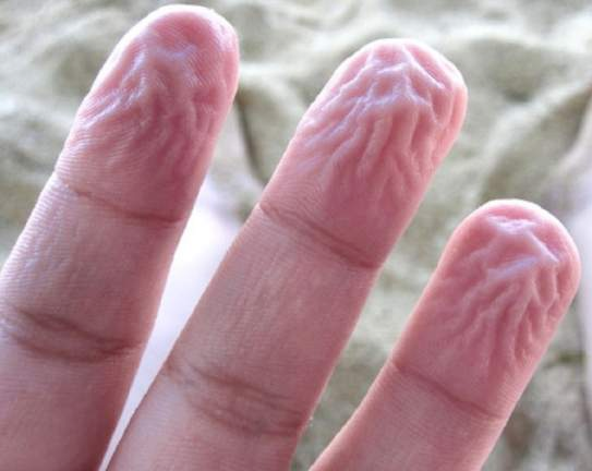 “(Of the hands or feet.) Prunelike after an overlong bath.”