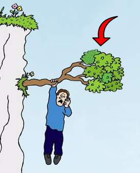 “A small bush from which cartoon characters dangle over the edge of a cliff.”