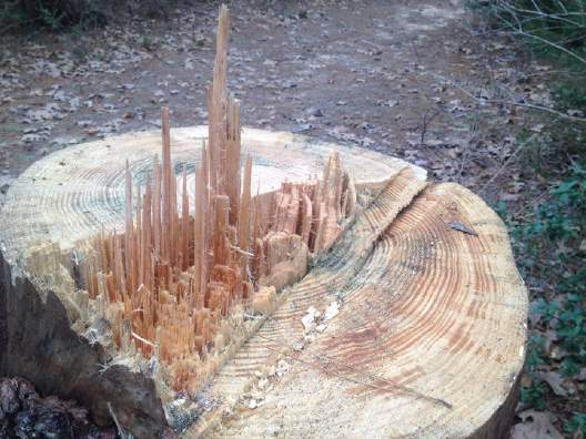 “The sharp prong on the top of a tree stump where the tree has snapped off before being completely sawn through.”