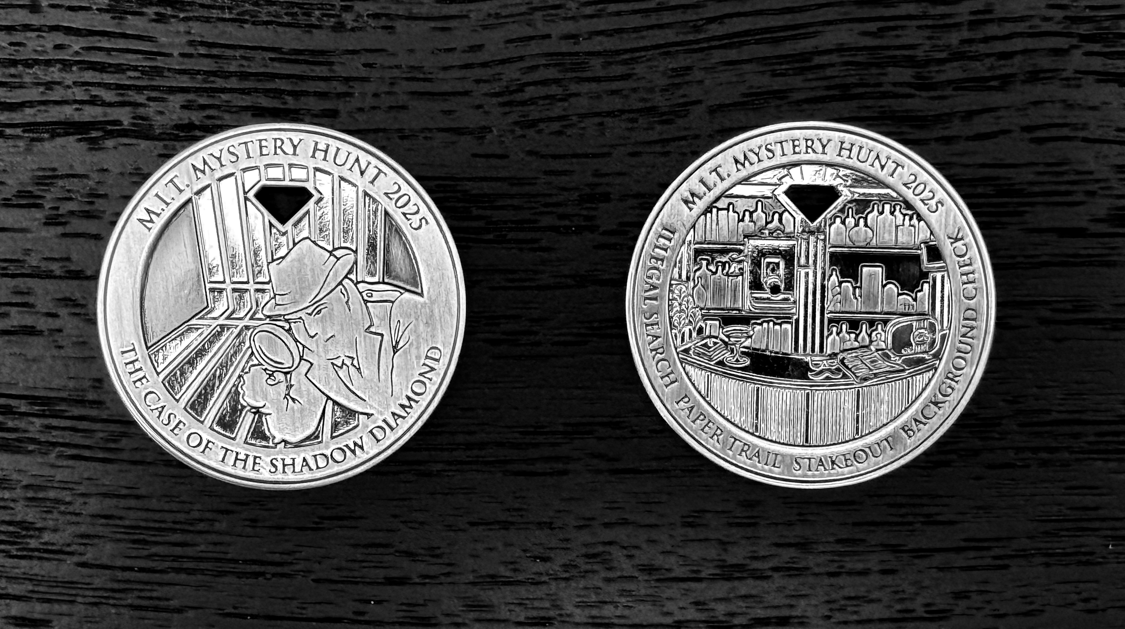 The 2025 MIT Mystery Hunt began with the disappearance of the famed Shadow Diamond, plunging into the middle of a noir mystery. As teams joined up with the local gumshoe, they investigated each of the major characters, culimating with cracking into the vault of MITropolis's notorious Finster crime family. Nobody was able to recover the Shadow Diamond, but they instead received a stash of surprisingly coin-like counterfeit jewelry manufactured by one of the characters.