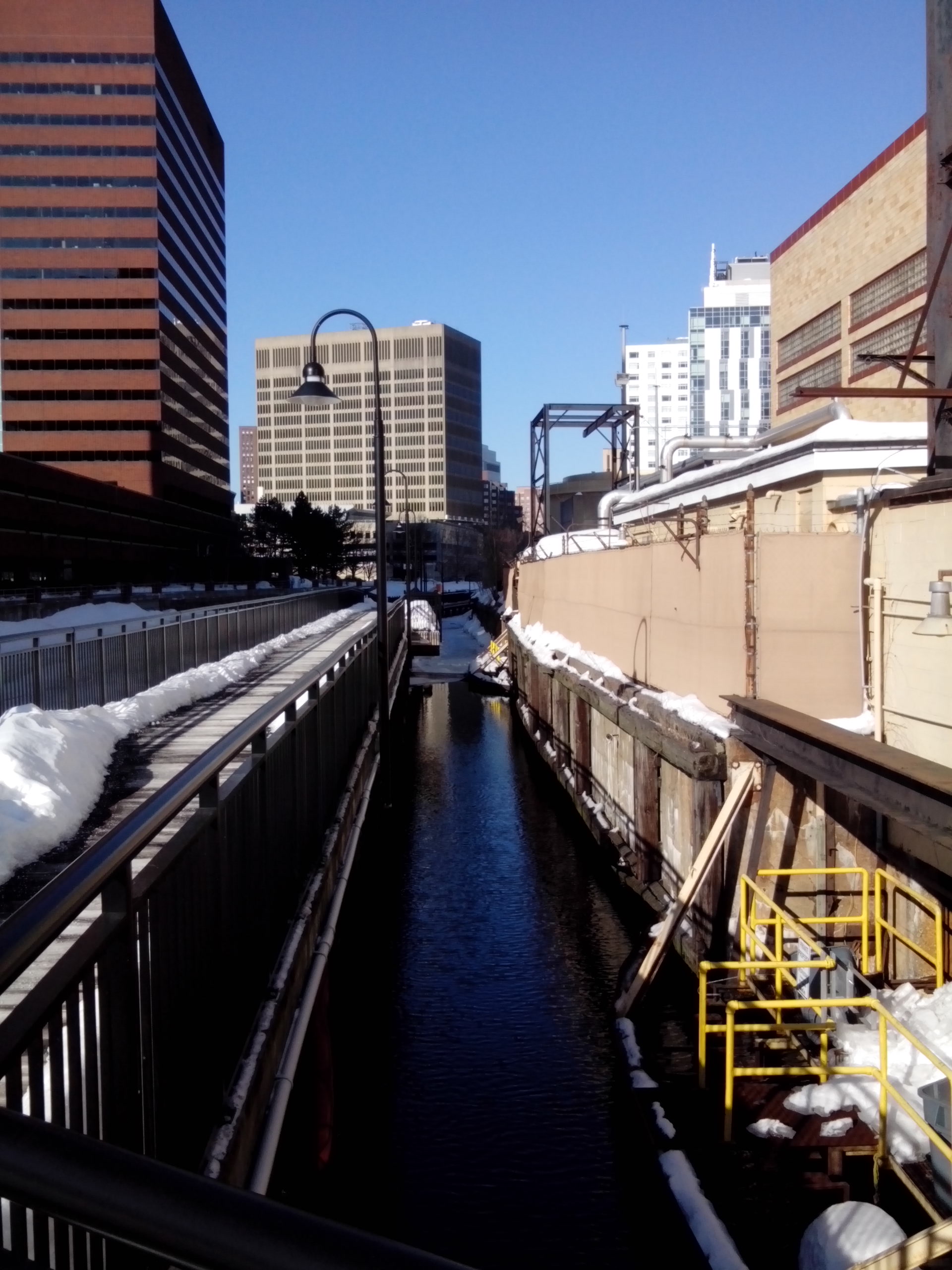 Broad Canal bordering Veolia building “A city’s energies falter or shift gears in predictable ways and places…A “break”, as I am using the term, occurs where there is an abrupt, visible switch in the direction and/or the design of the streets.” — from Close Up: How to Read the American City. I examined this idea in my second journal entry and return to it now because of the way First Street, Edwin H Land Blvd and the Longfellow Bridge come together over/near the Broad Canal. Most of my site is split up smoothly between Kendall and corporate spaces that flow smoothly towards the Charles, and while I don’t think this is a break in exactly the way Clay envisioned, the combination of roads, the Broad Canal and the Longfellow Bridge seem to smother each other in what is too tight of a space. I feel like this could complicate navigation and would also be a great place to study the way uses of land overlap.