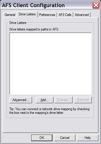 Result: The AFS Client Configuration dialog appears. - Select the Drive Letters tab.