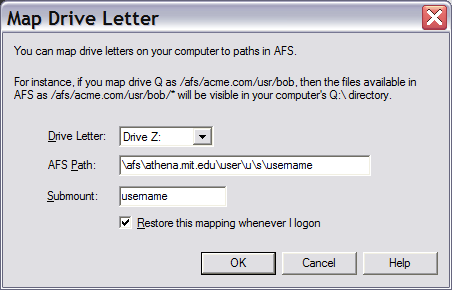 Result: The Map Drive Letter dialog appears. - To map your Athena home directory, determine the path to your directory.